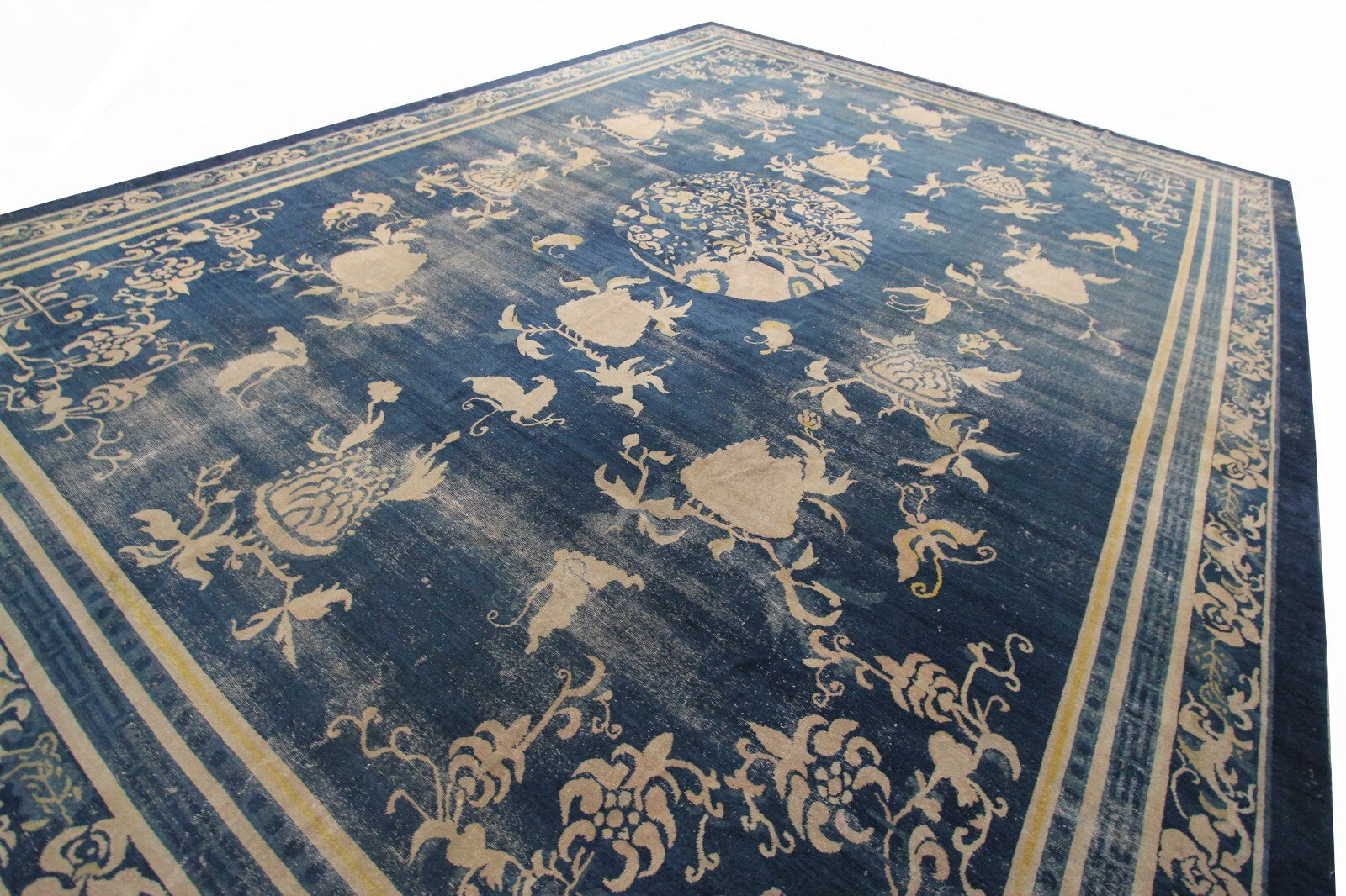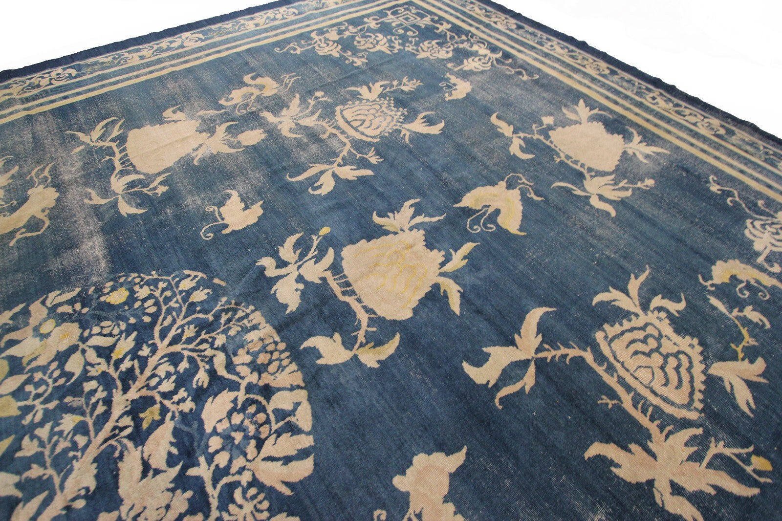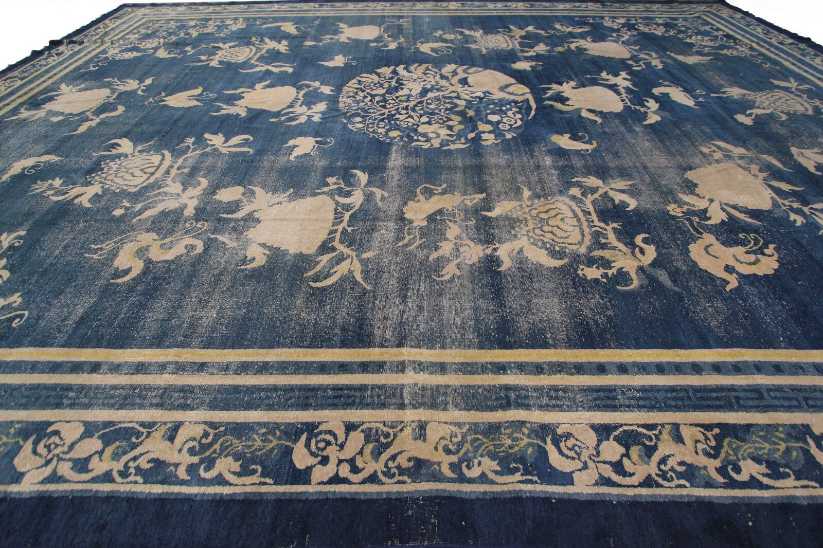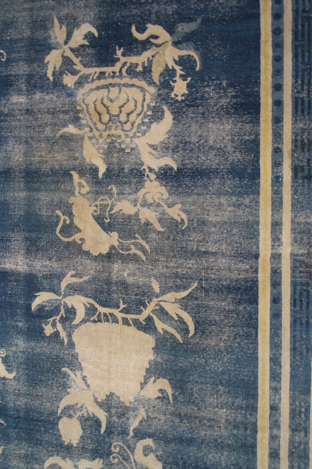"THIS RUG IS EXQUISITE!!! It is a rare oversize Antique Chinese Peking Art Deco rug with a beautiful geometric design. The fine weave, the fabulous blue background color, and the ©"Shabby Chic thin Pile make this rug a true show piece!