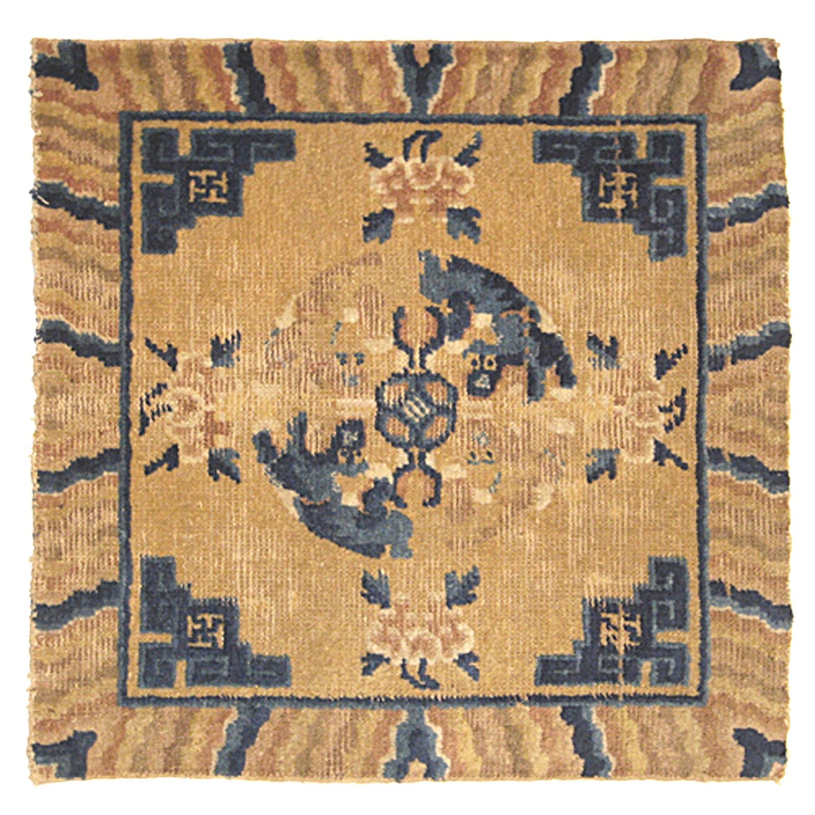 "This is a spectacular square 18th Century Collector antique Ningxia Art Deco Fou Dog rug in 2' x 2' . This rare and beautiful rug has a Fou Dog design in a Yellow, beige and blue palette- A fantastic buy!"-DCR