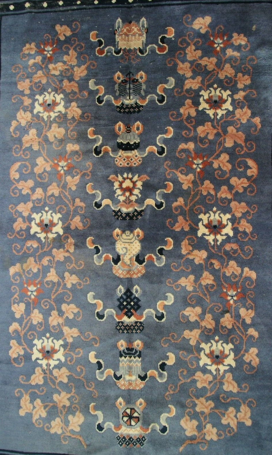 "This is a rare Antique Chinese Peking Ningxia Ningshia rug with a unique treasures design and and a fine weave. This incredible and unusual Antique piece is a fine example of the art of Ancient Chinese rug weaving- it can be used on the floor as well as using it as a wall hanging!