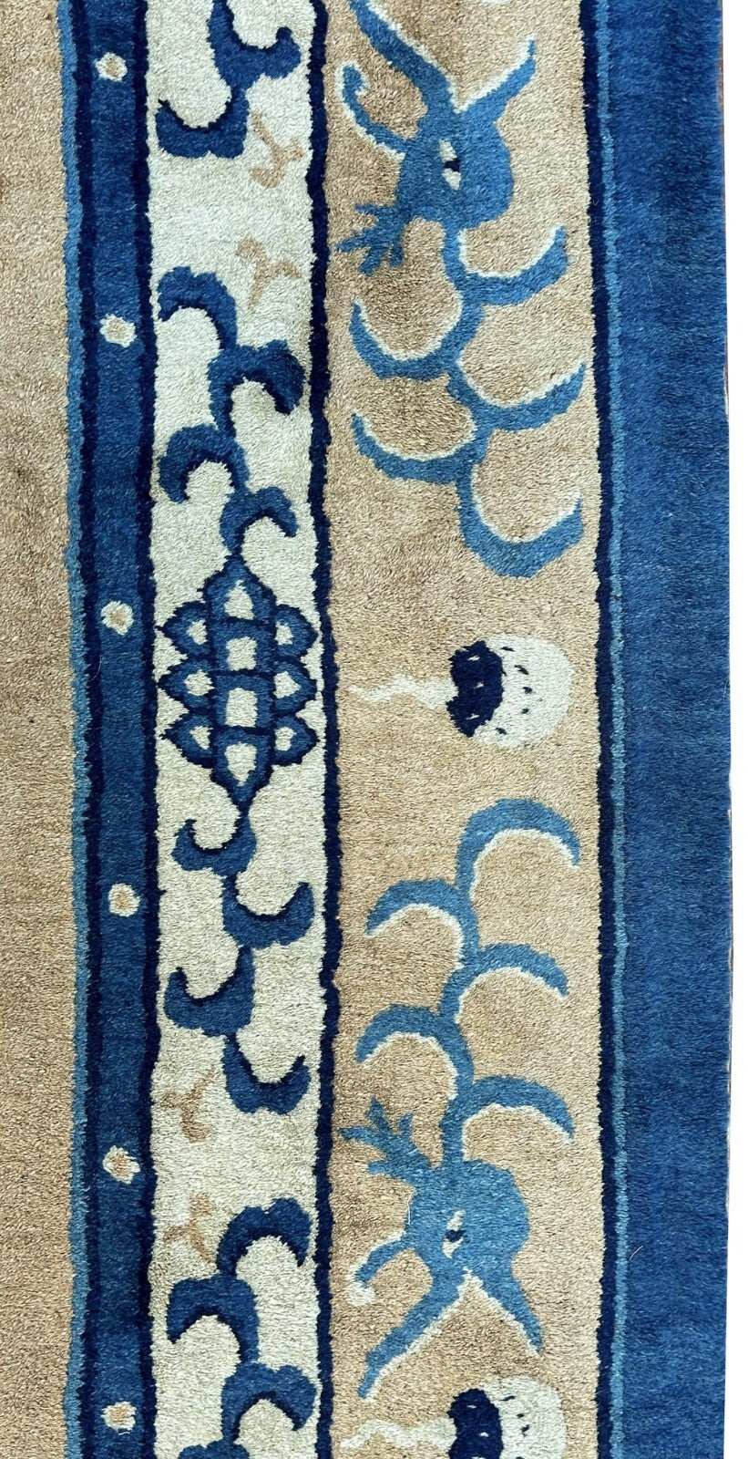 "This is a magnificent Rarer One of a kind fine quality rare Antique Peking Chinese Art Deco rug. The Center Medallion Shou symbol symbolizes longevity, immortality, happiness and a harmonic life. Rare 5 paw Dragon. This is a true treasure." -DCR