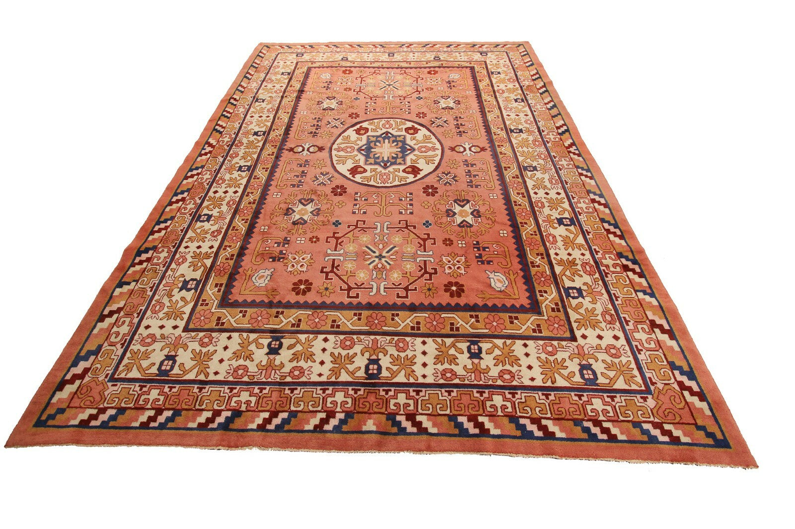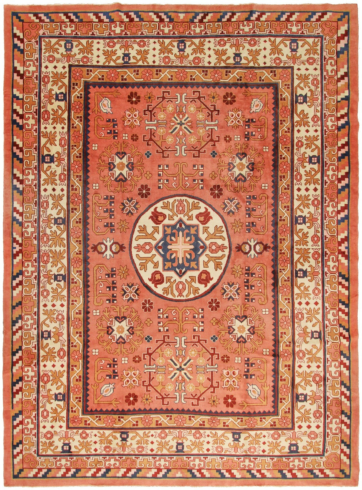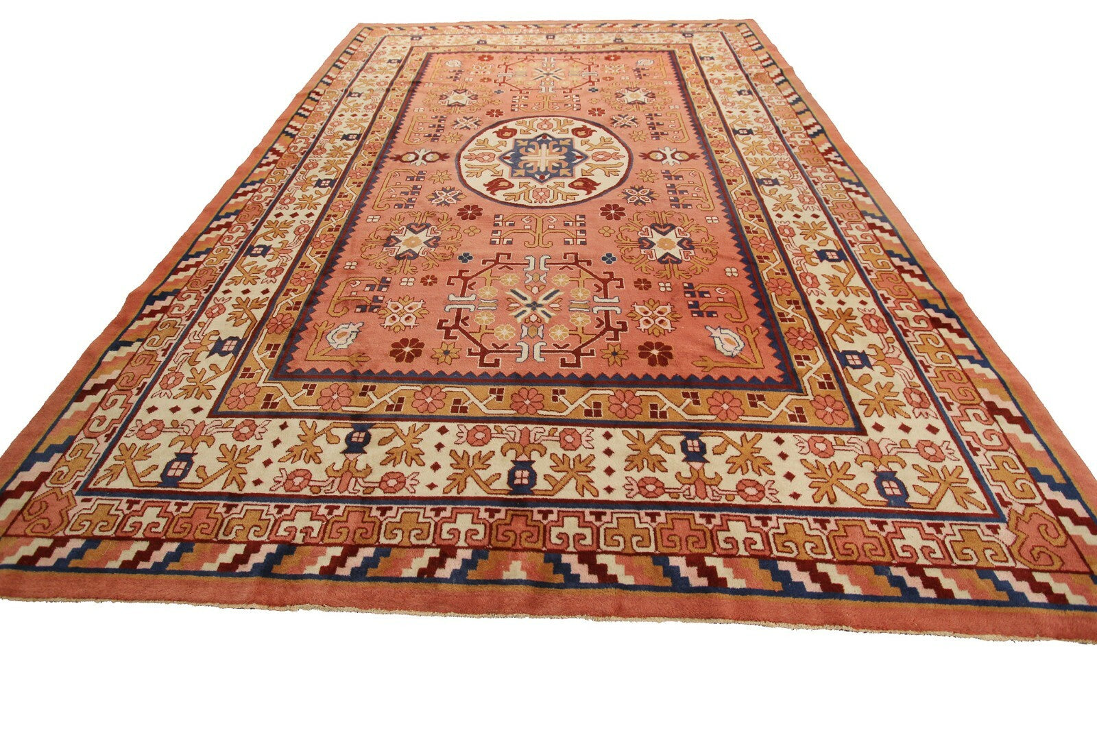 "This an exquisite Rare vintage Hand made Chinese Art Deco Art Nouveau Khotan rug in a rare geometric design. This piece was just acquired from a New Jersey Estate"-DCR