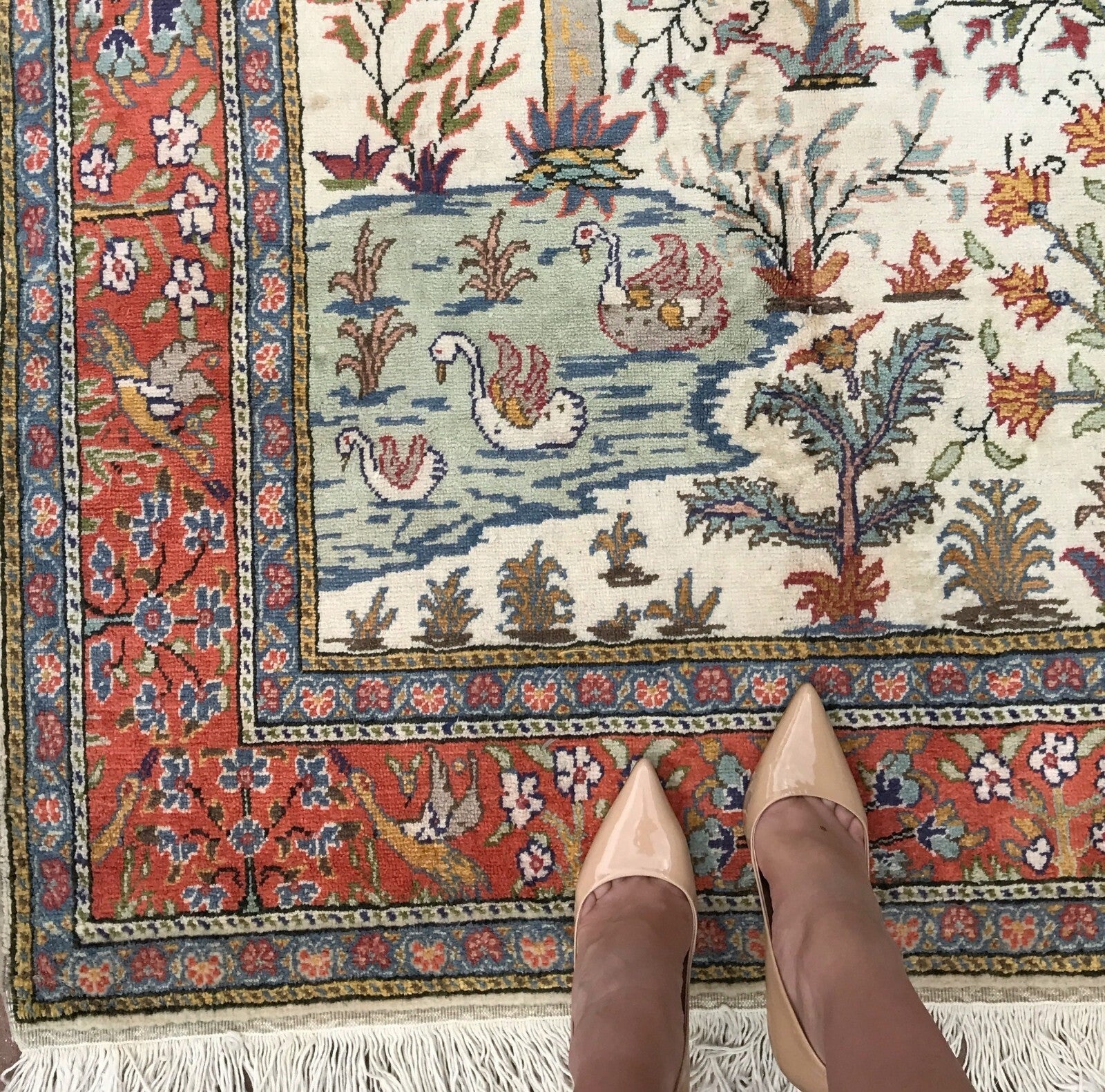 "This is an exquisite Vintage Cotton Turkish Hereke Kaysari rug from 1950. It has a fine weave with a rare Tree of Life, Birds and Swans Design. Artistic piece- true artisan workmanship."