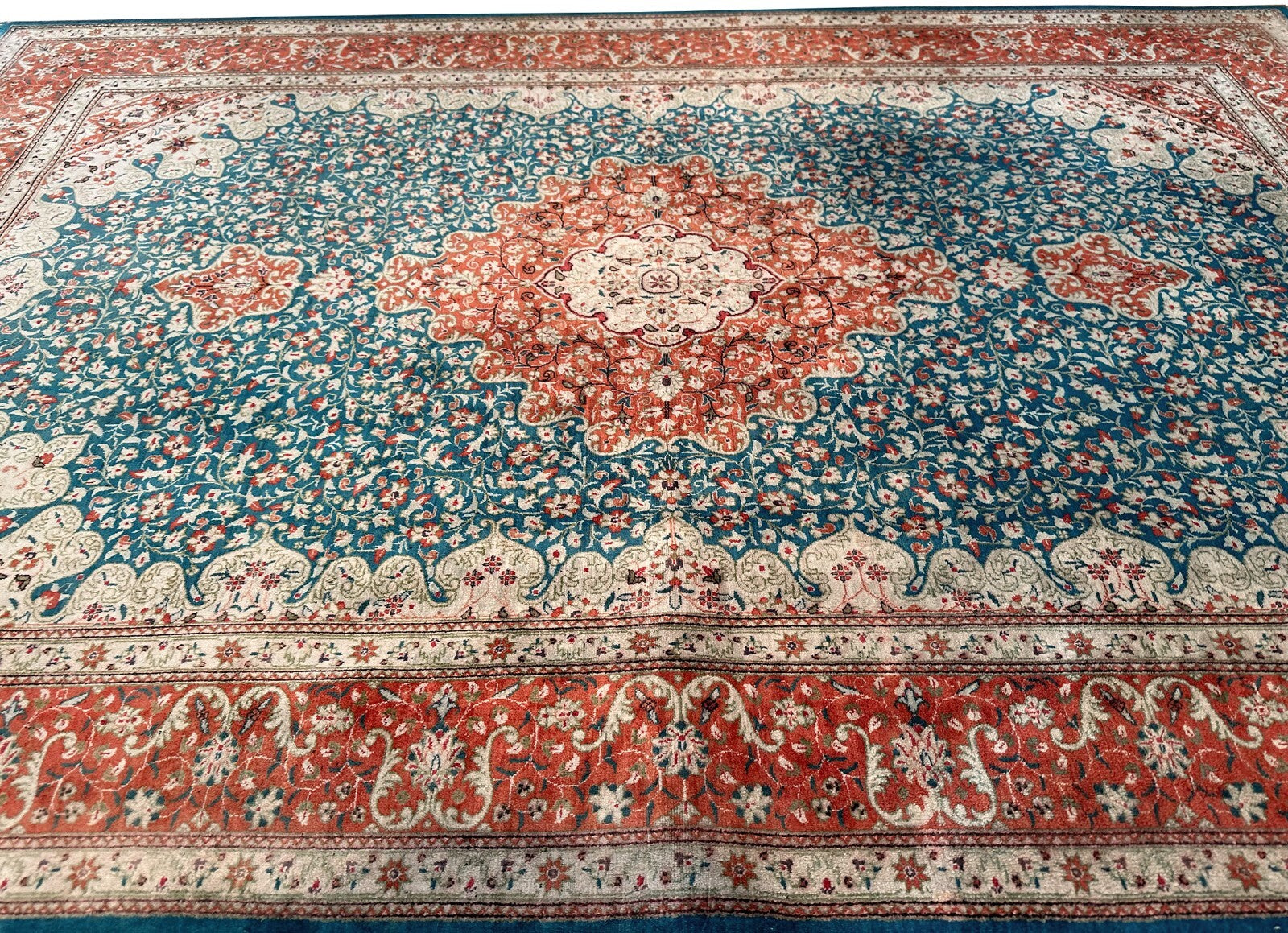The creation of this rug involves many processes, including spinning, weaving, washing, trimming, and finishing, all done by skilled weavers.