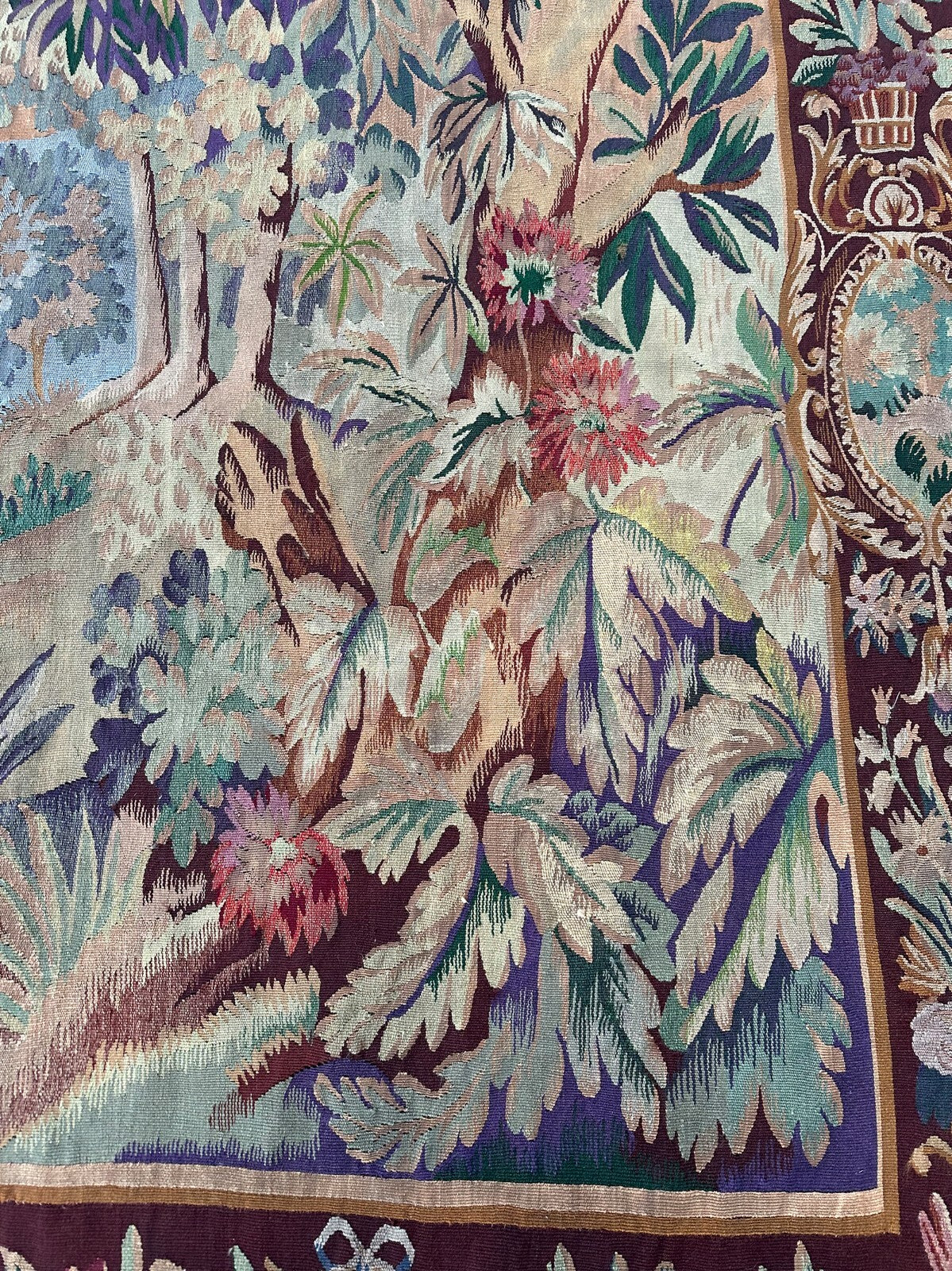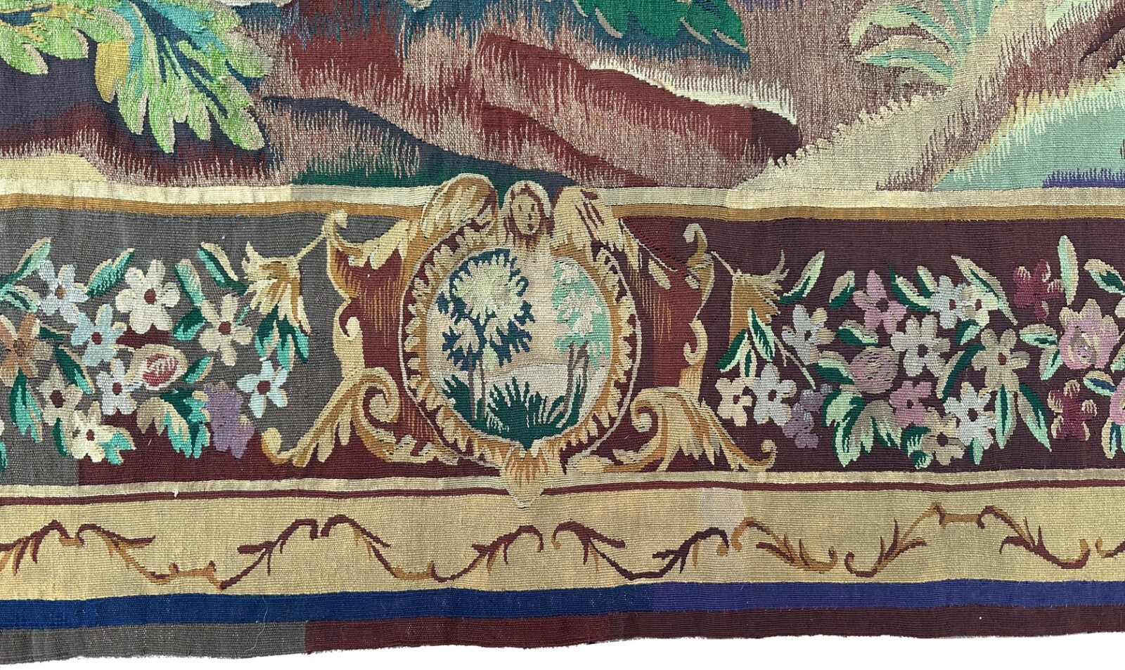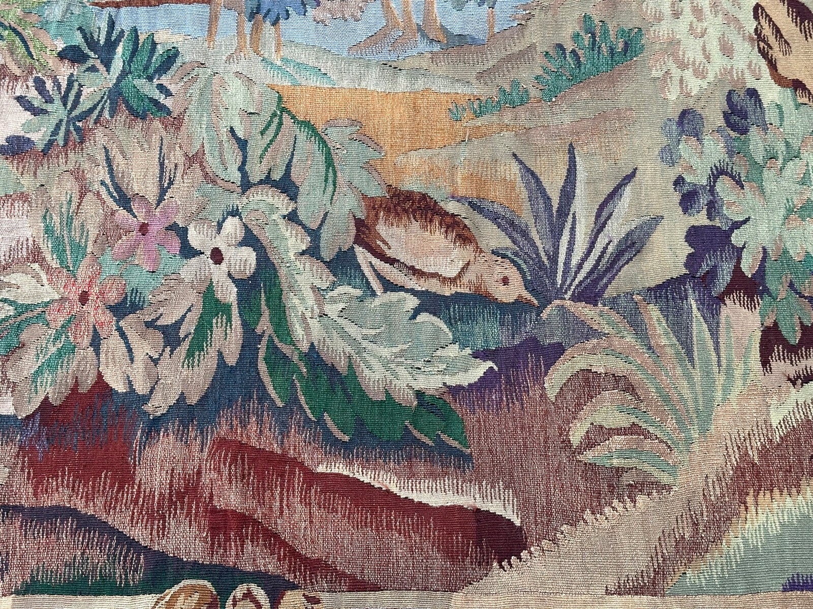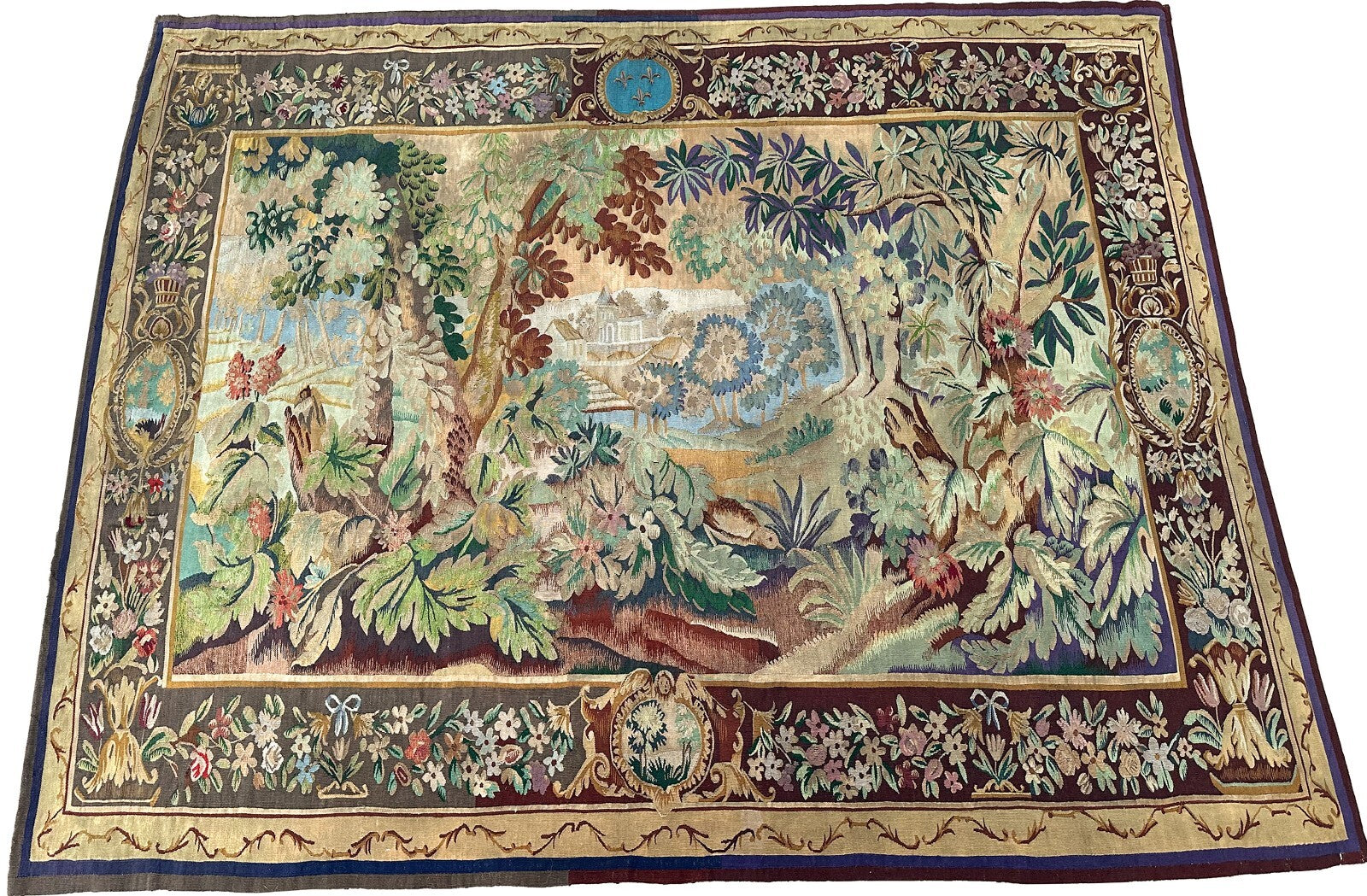 "Beautiful antique French tapestry depicting a scenic view including magnificent art nouveau motifs, beautiful trees, and greenery. A chic, neutral antique piece to add elegance to any room." DCR