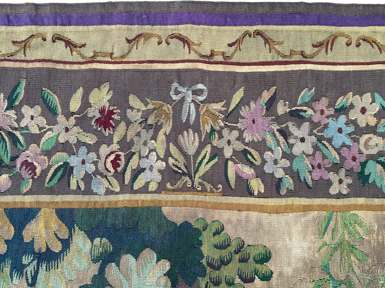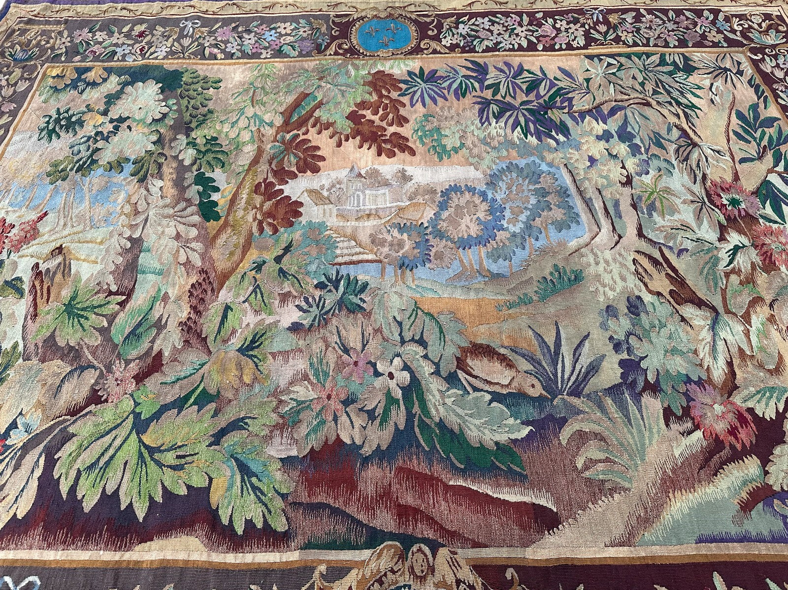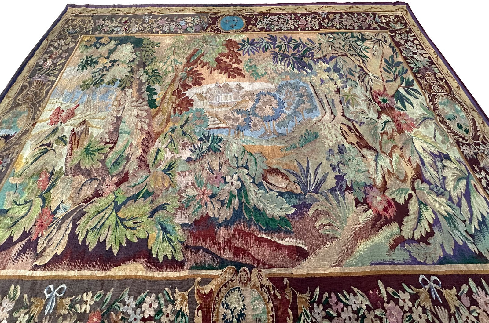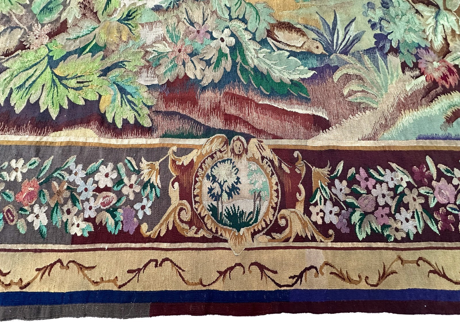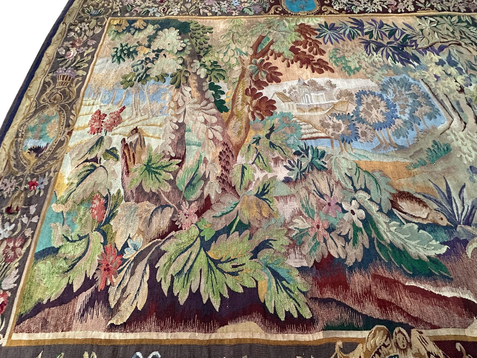 "Beautiful antique French tapestry depicting a scenic view including magnificent art nouveau motifs, beautiful trees, and greenery. A chic, neutral antique piece to add elegance to any room." DCR