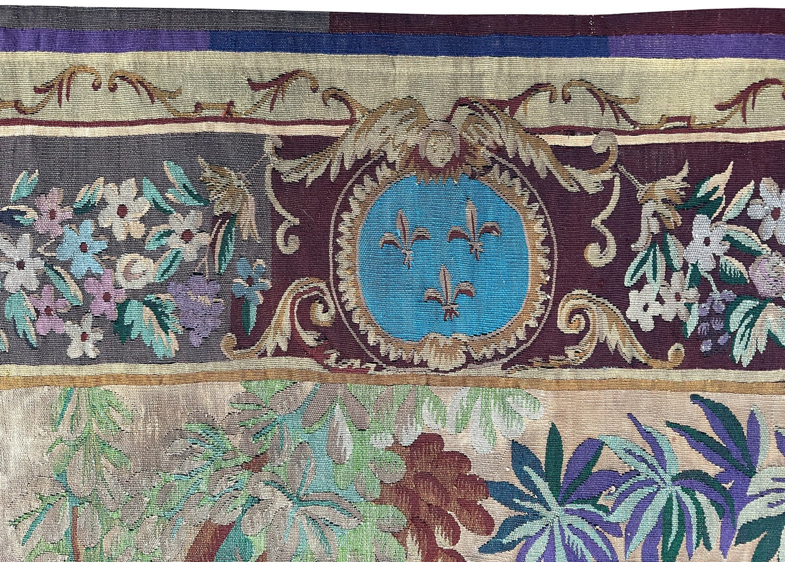 This is an Antique French 19th Century wall tapestry depicting a central scene motif with a house surrounded by forest and floral motifs. The tapestry has a framing floral motif centered by the Arms of the Kings of France with a blazoned Azure blue ground and three fleurs-de-lys.