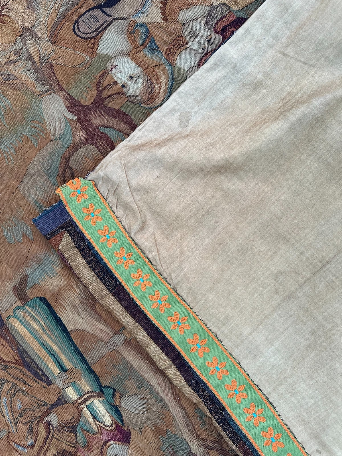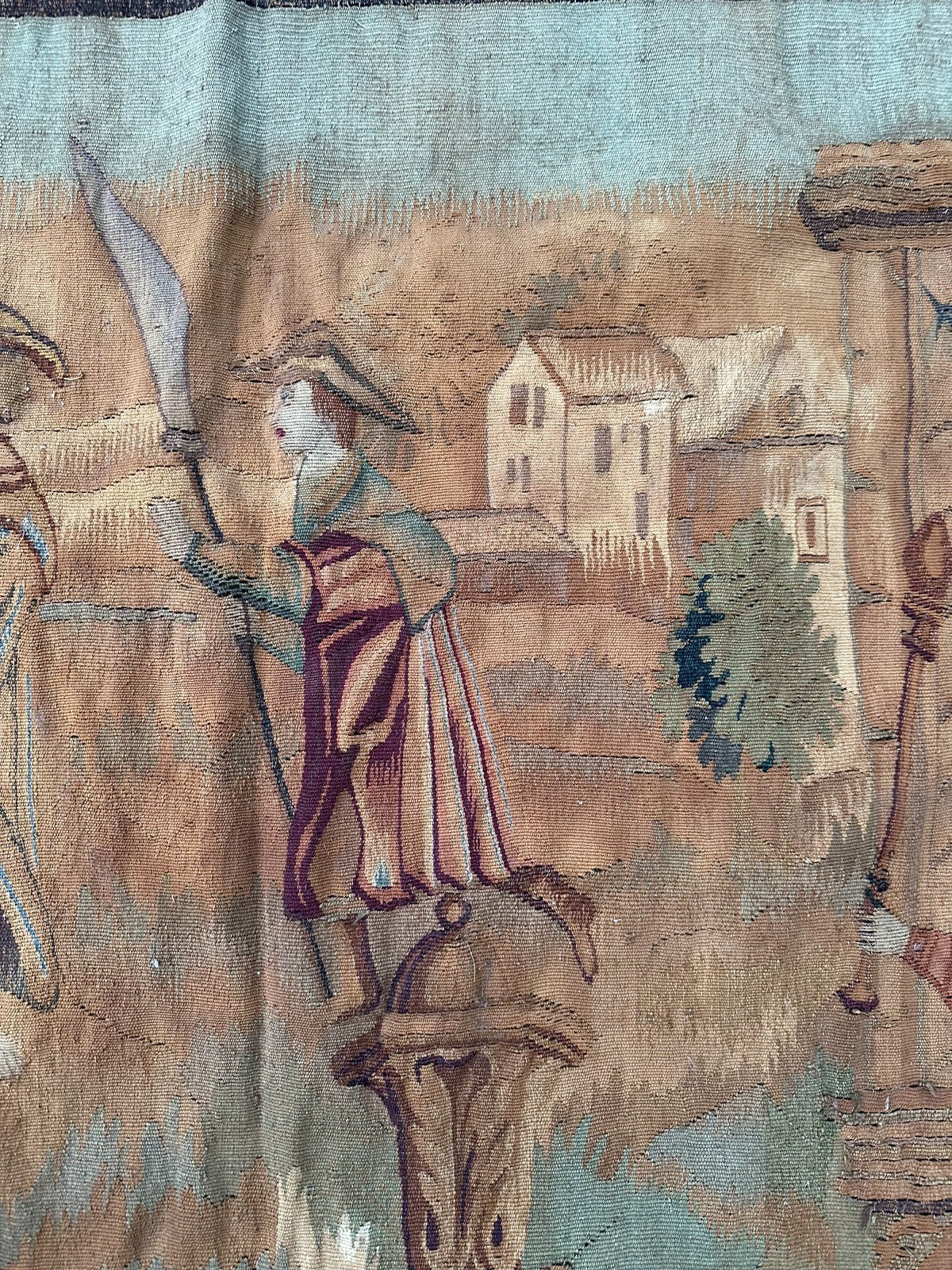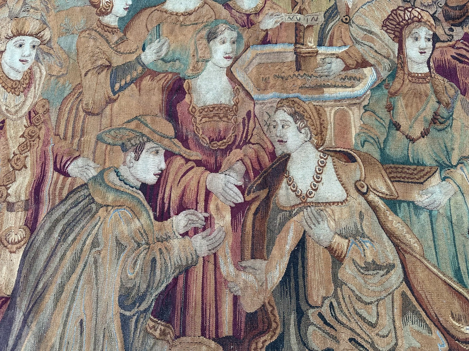 "Beautiful antique French tapestry depicting a ceremonial court scene with finely dressed figures, architectural details, and lush decorative borders. A chic, refined antique textile that adds historic elegance and character to any room." DCR