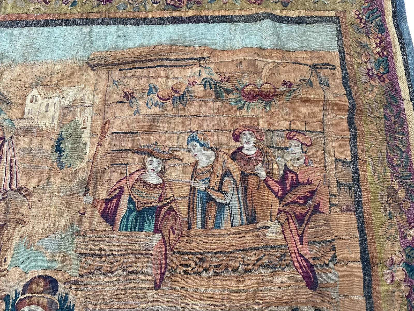 Beautiful antique French tapestry depicting a ceremonial court scene with finely dressed figures, architectural details, and lush decorative borders. A chic, refined antique textile that adds historic elegance and character to any room.