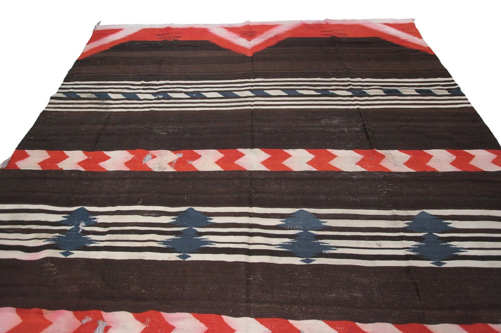 “This antique Navajo-style flatweave tapestry features strong geometric bands, rich earthy tones, subtle woven texture, and traditional stepped-pattern details that highlight its timeless design.” - DCR
