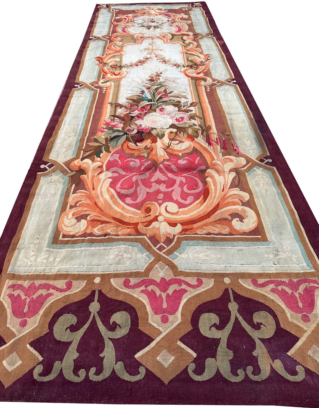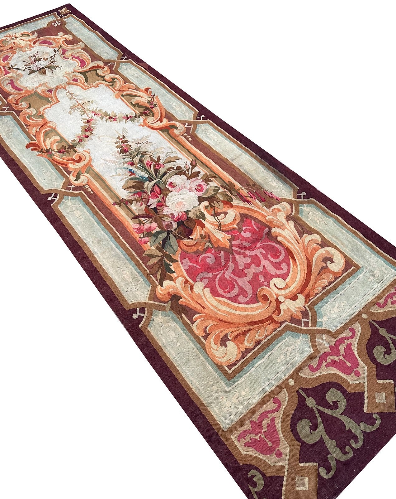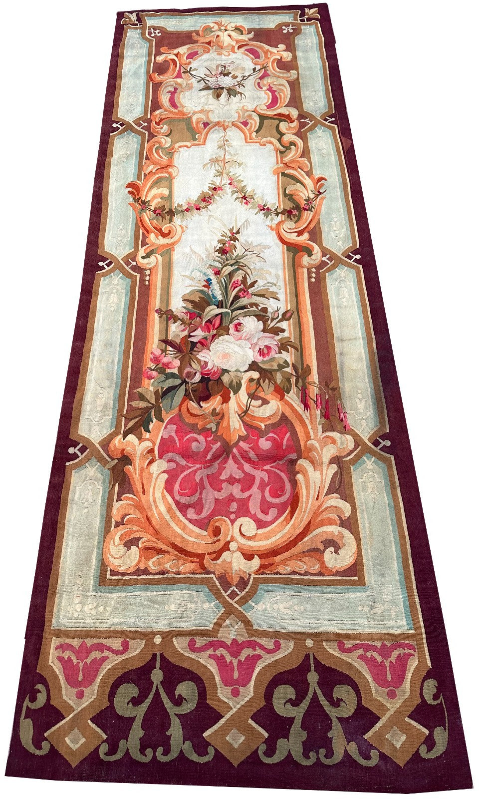 Antique French Aubusson Tapestry Rug Floral Vase Runner 3x9 Circa 1880 94x284cm