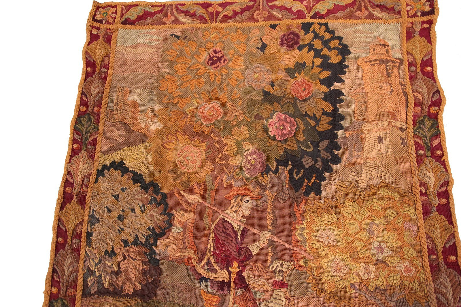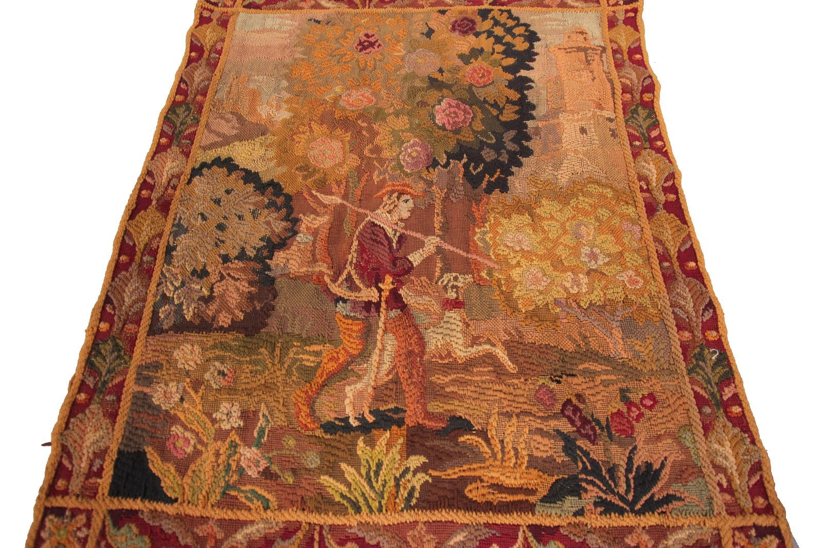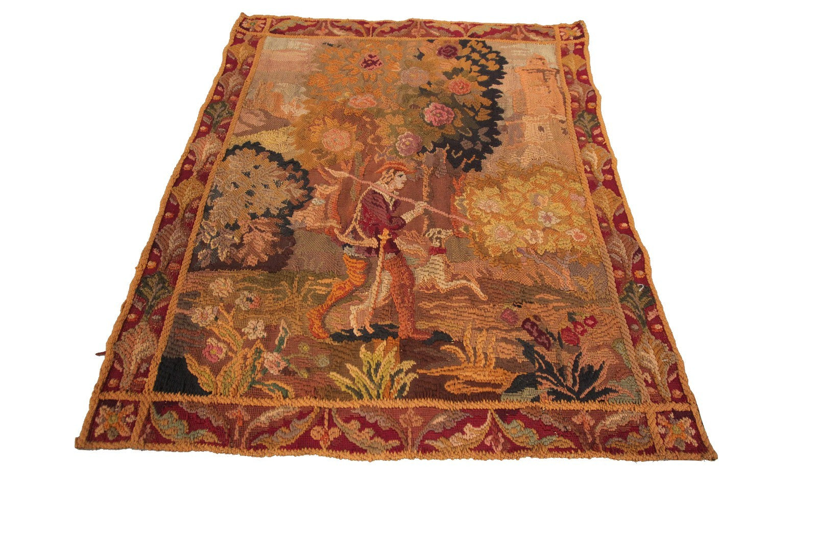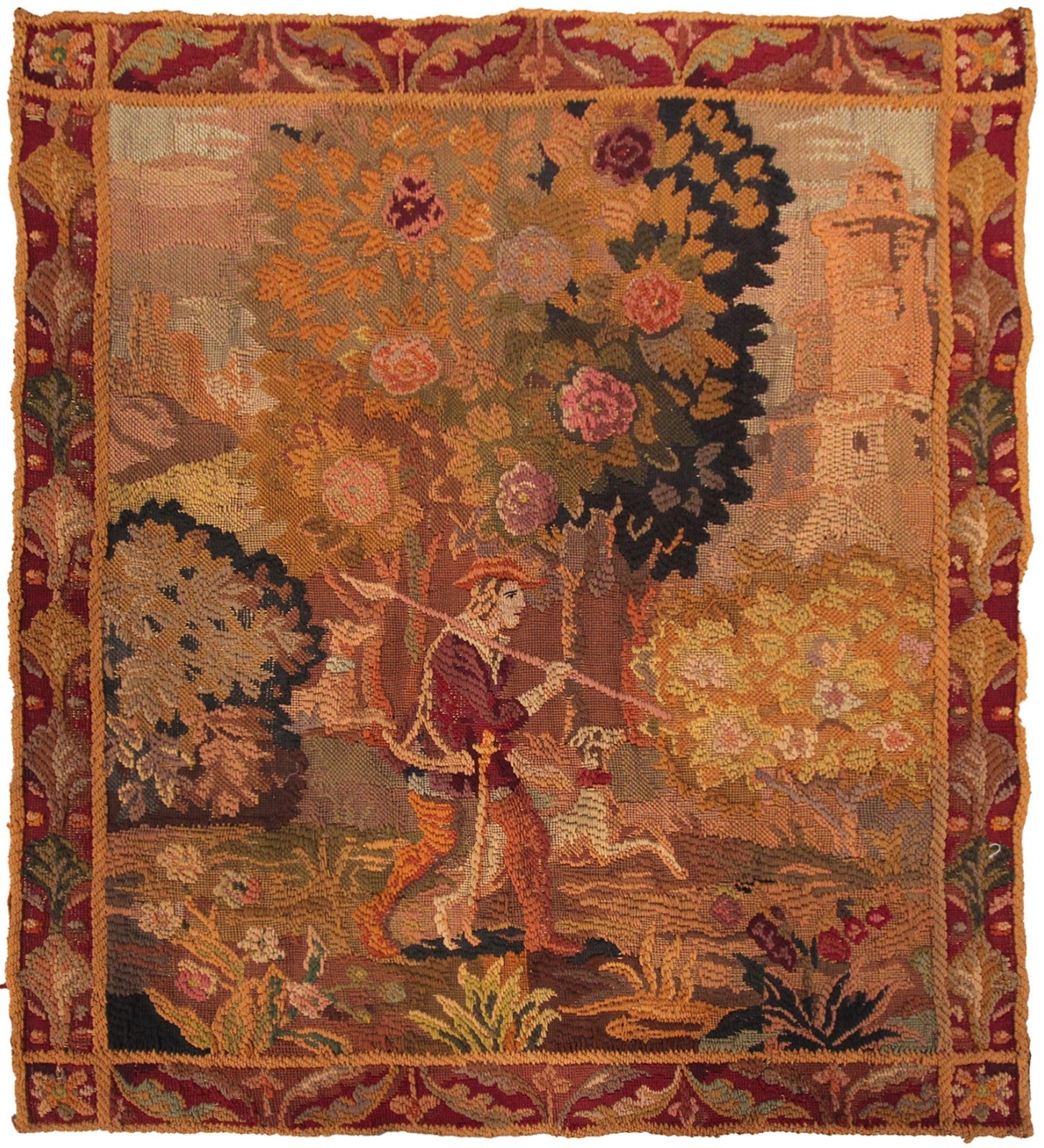 "This is a rare authentic Antique French Tapestry, woven with richly dyed wool and depicting an elegant hunting scene with a hunter, his dog, verdure foliage, and a distant tower rendered in remarkable detail."- DCR