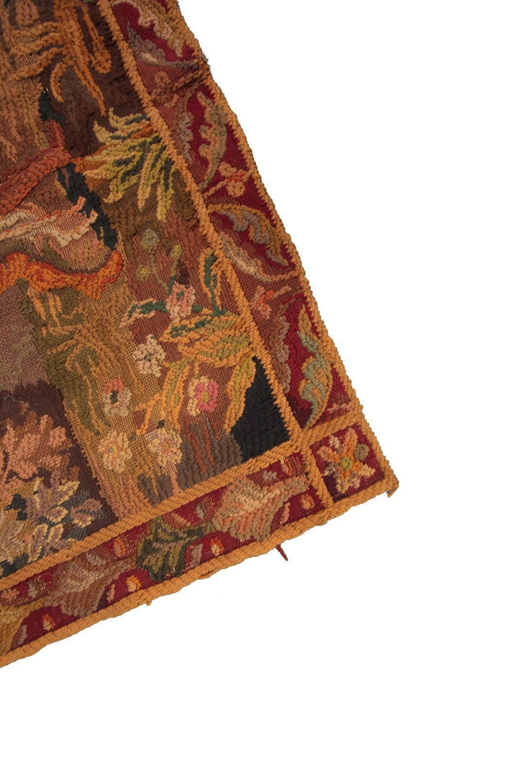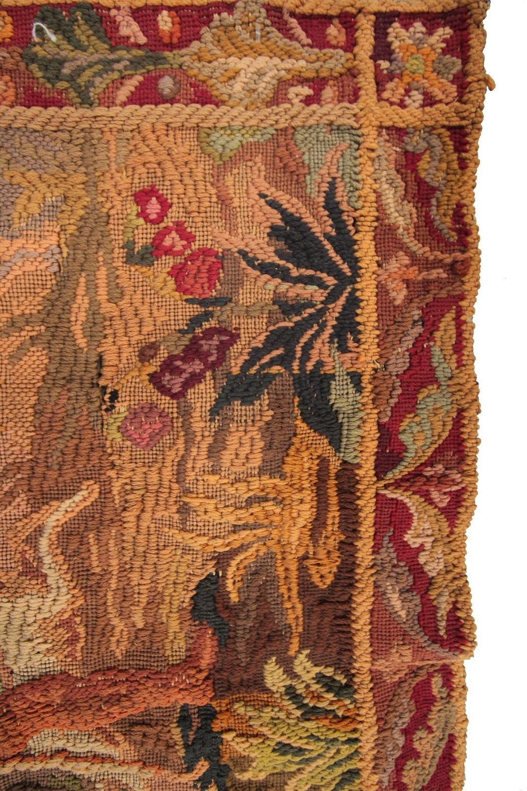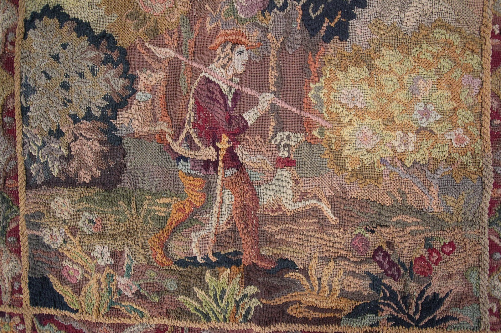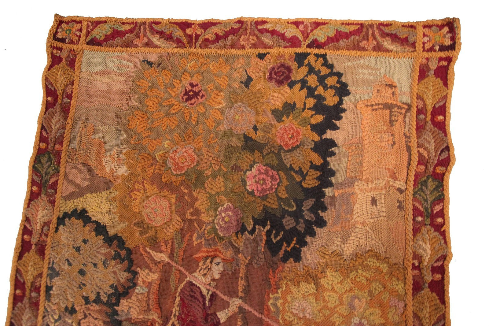 "This is a rare authentic Antique French Tapestry, woven with richly dyed wool and depicting an elegant hunting scene with a hunter, his dog, verdure foliage, and a distant tower rendered in remarkable detail."- DCR