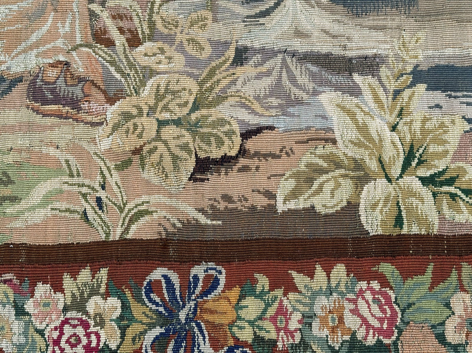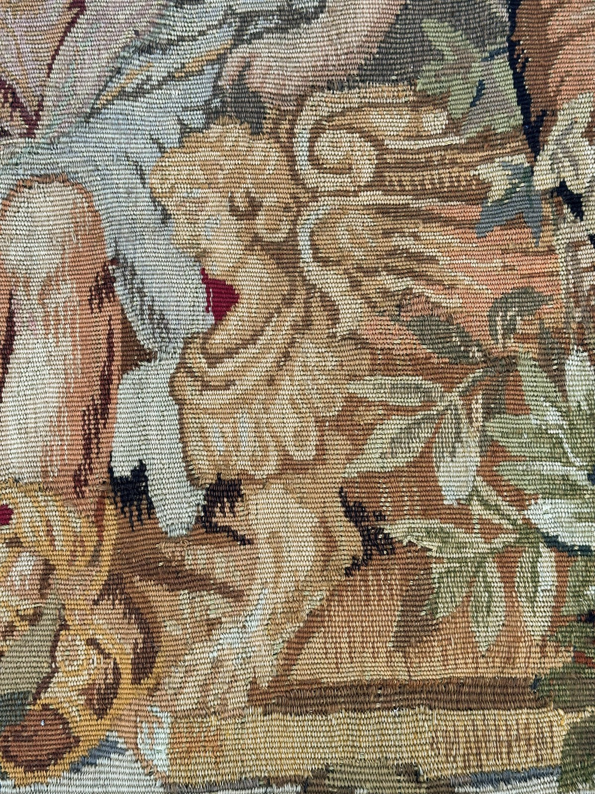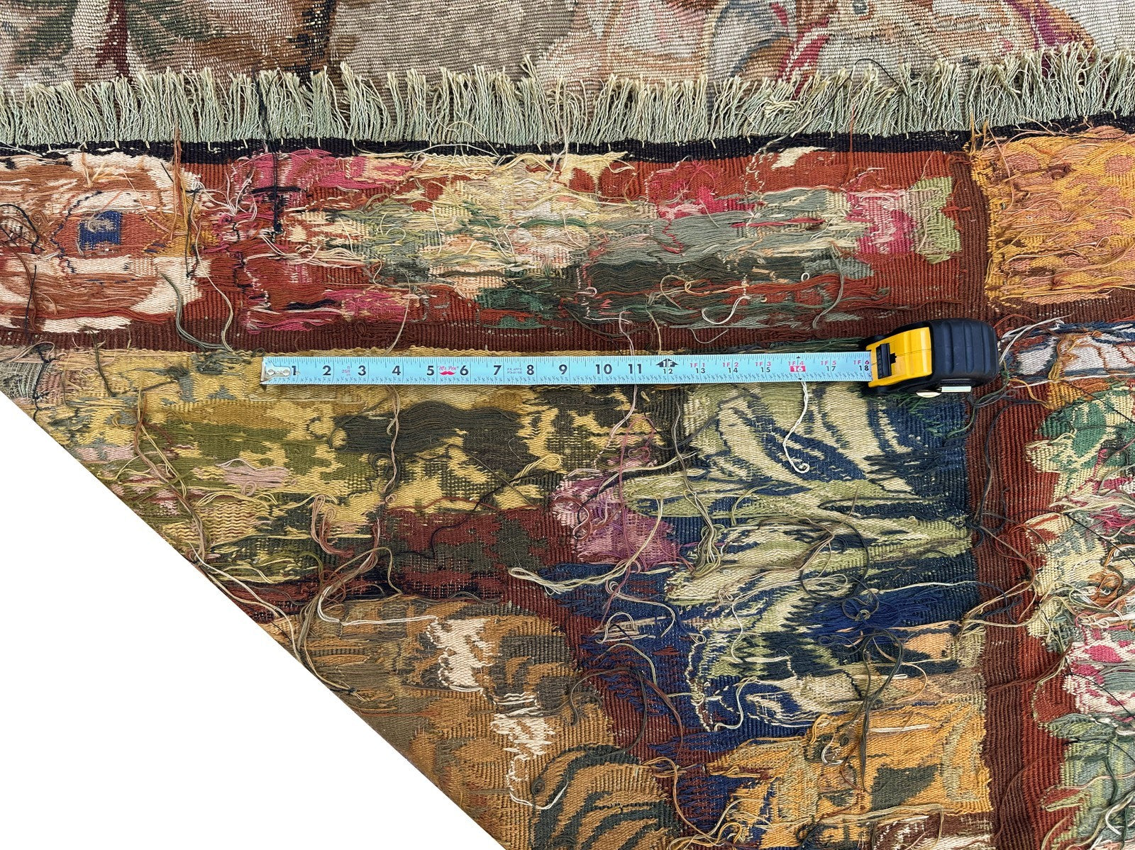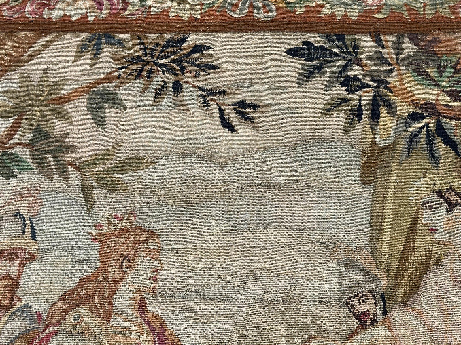 This handmade antique French tapestry is a high quality piece, featuring detailed human and verdure figures that give it a rich, elegant presence.