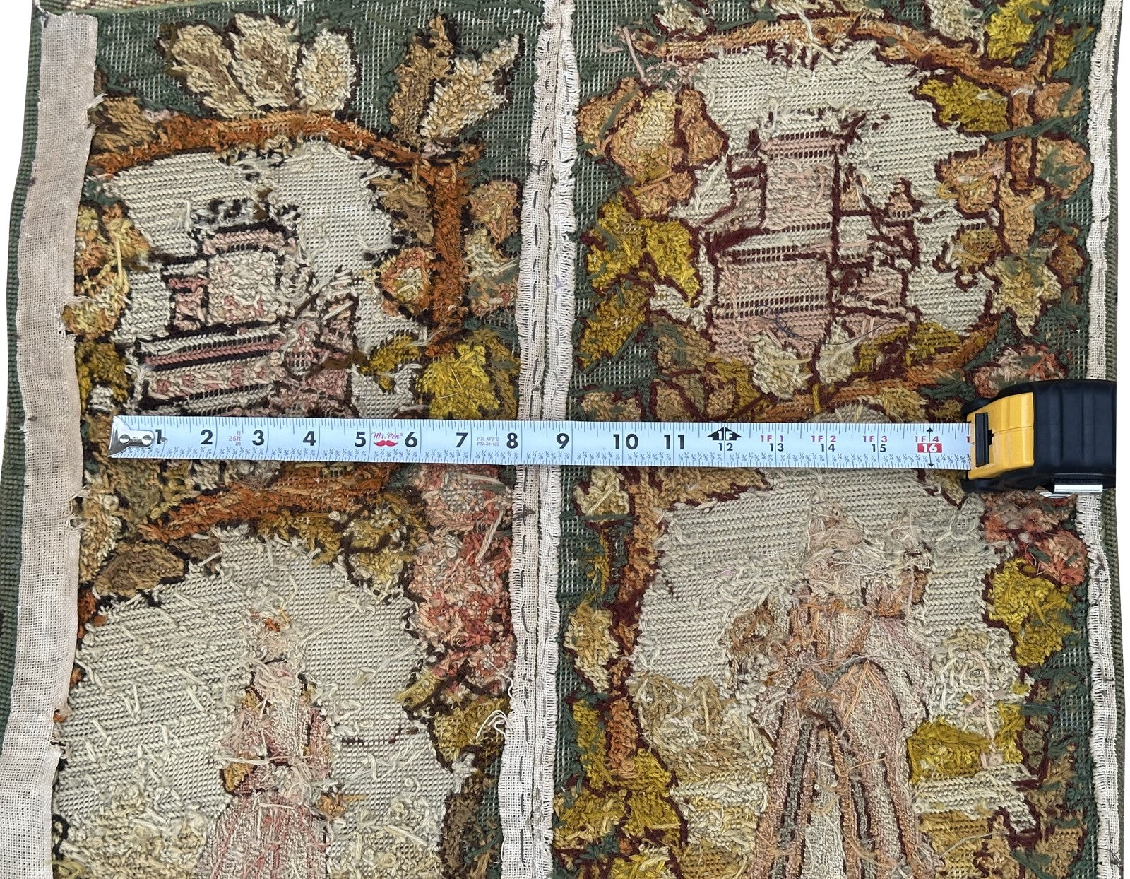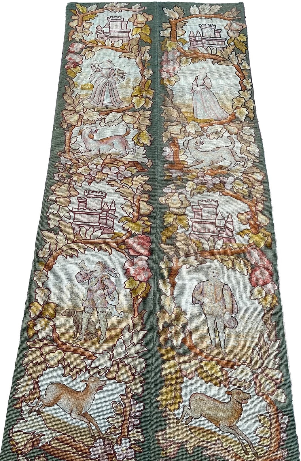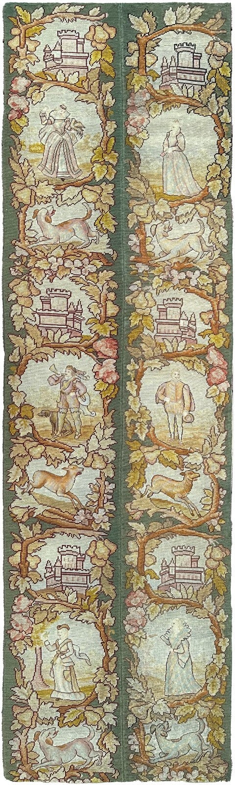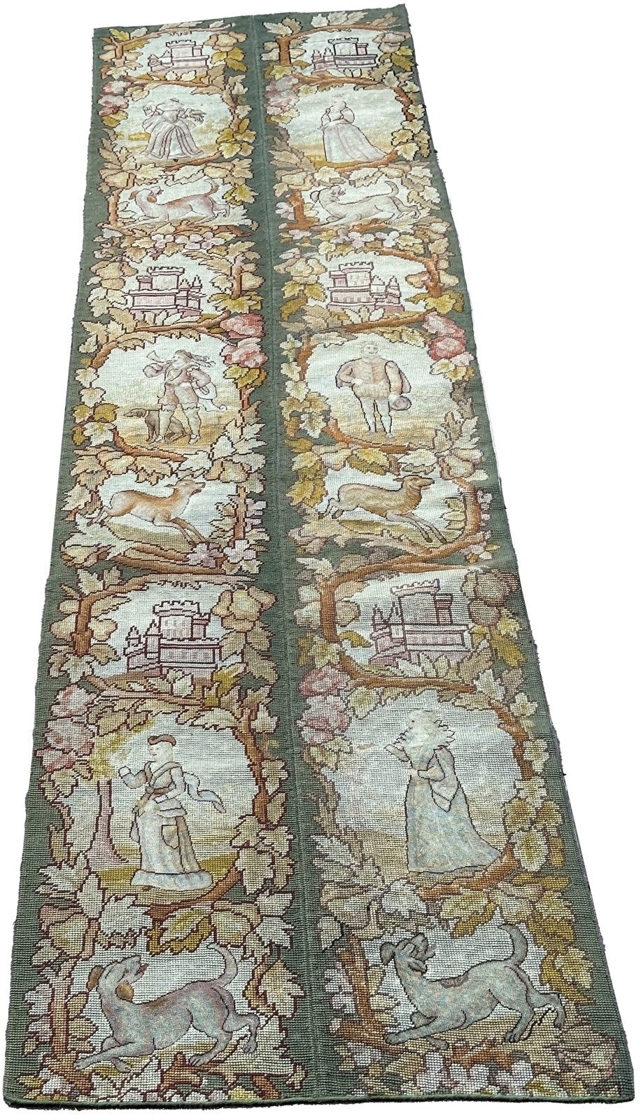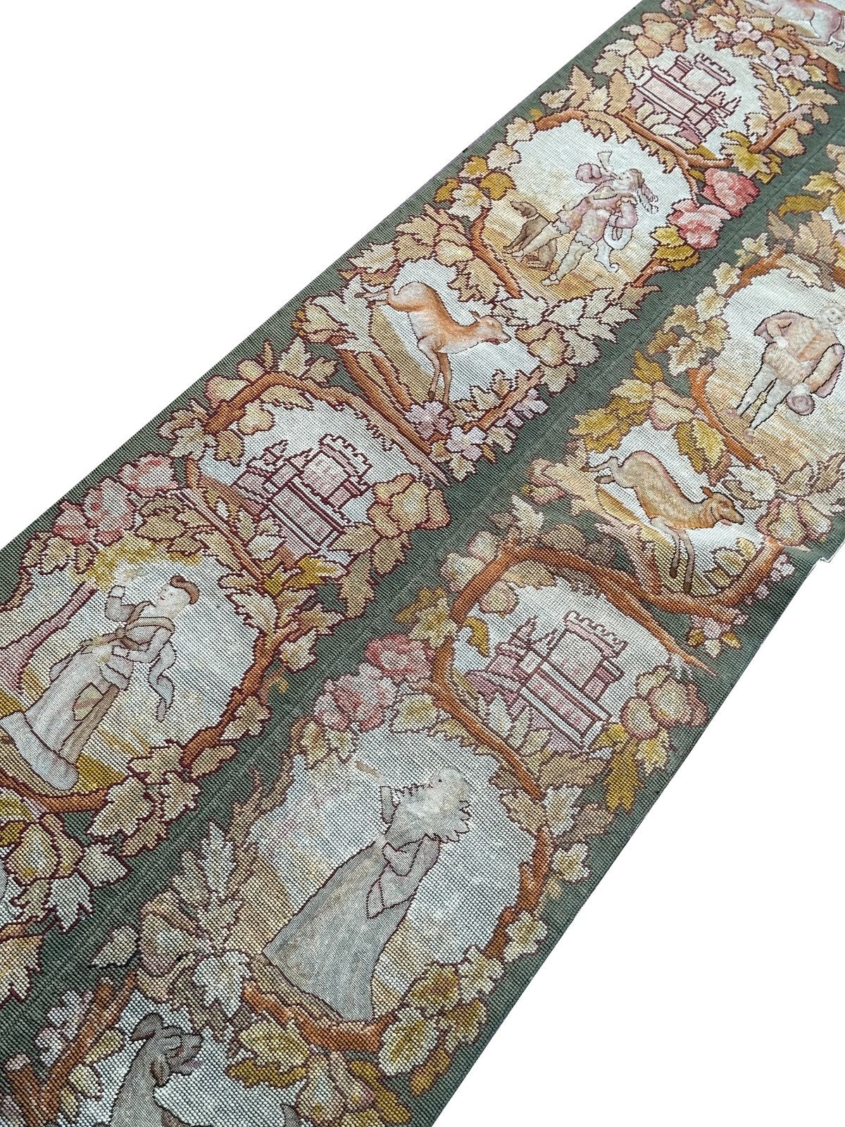 2x7 Antique English Tapestry Needlepoint  Wool Silk Human C.1920 56cmx218cm