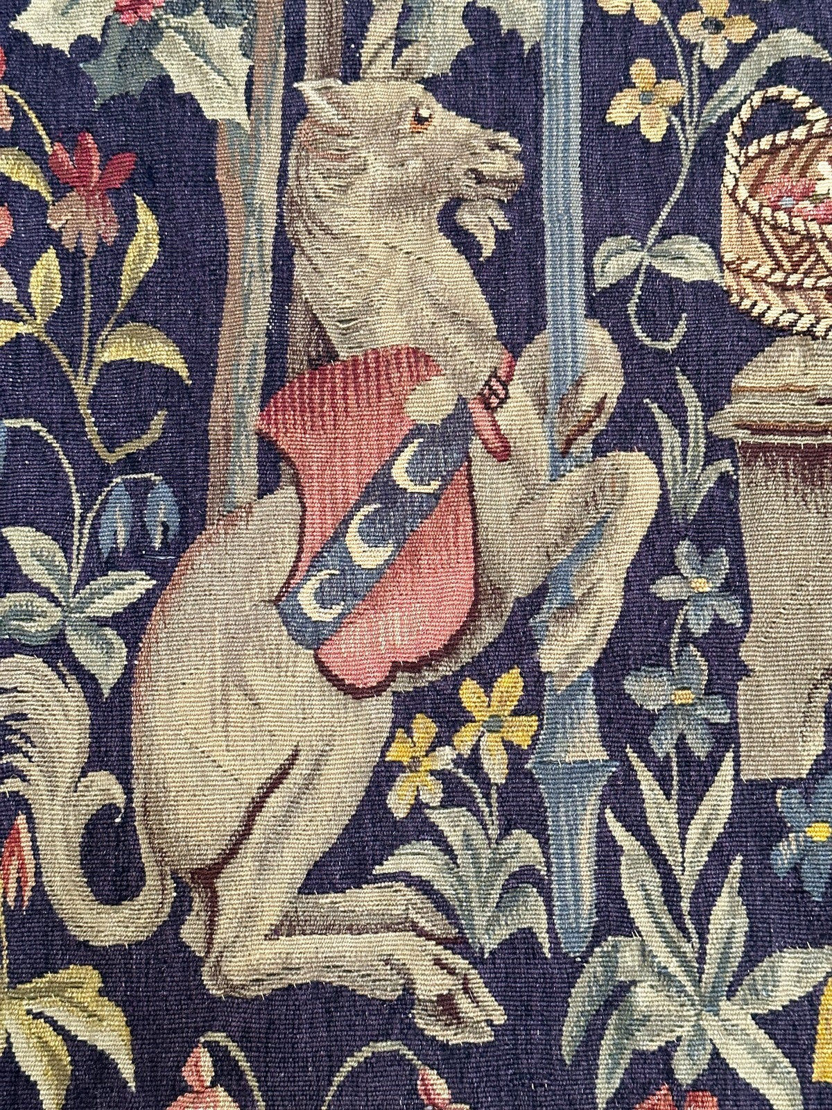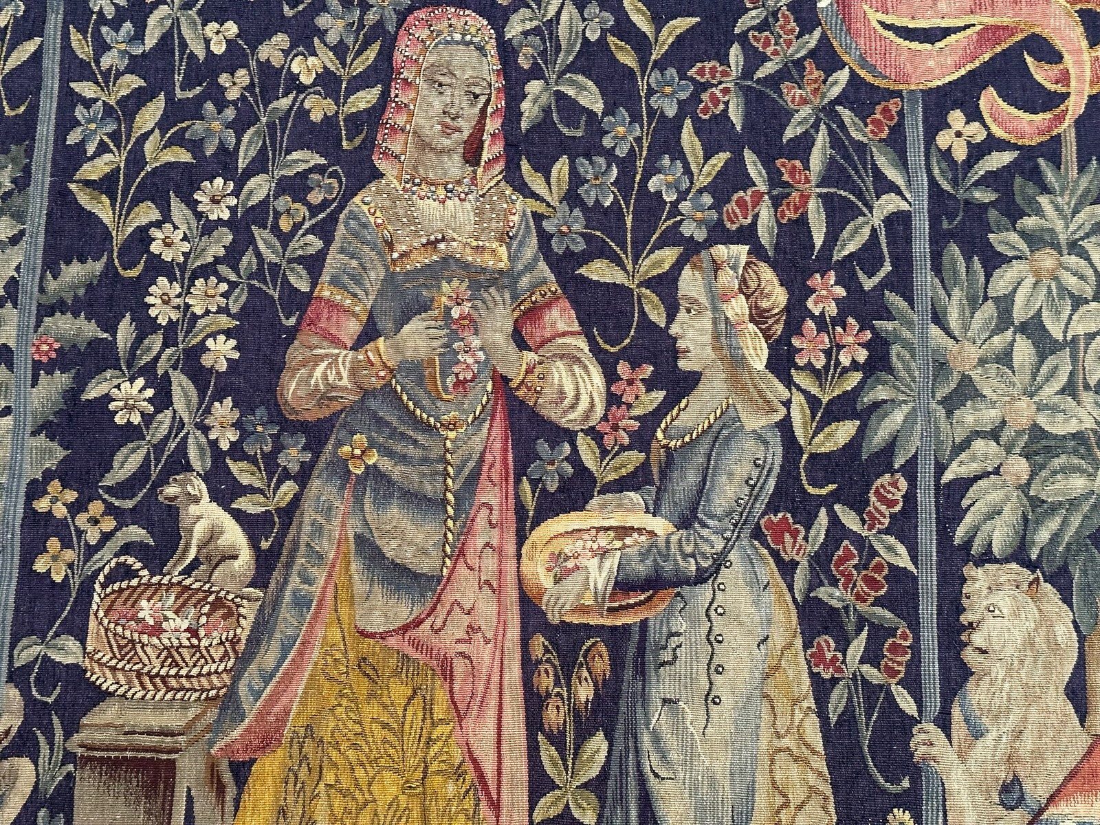 "This is an outstanding antique French Aubusson tapestry- This piece incorporates impeccable attention to detail, exquisite artisan workmanship, and an insane design. This piece depicts an intricate scene of noblemen amongst an array of botanicals, each floral more unique than the other. Pieces like this are highly sought after and hard to come by!"-DCR