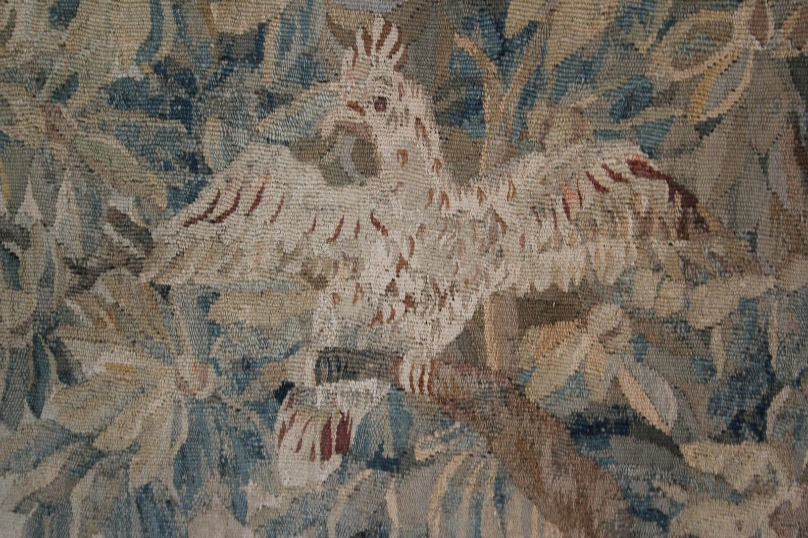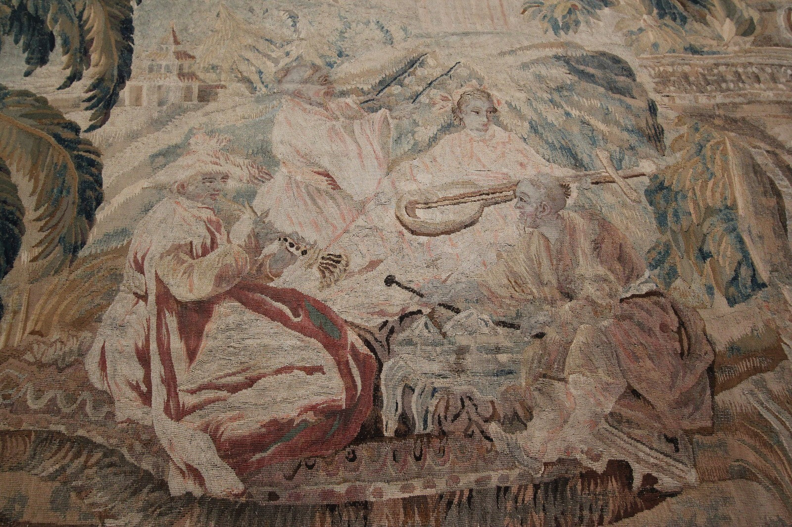 "This is very fine antique Flemish tapestry made of wool & silk depicting human figures playing instruments beneath a large palm tree. This exquisite piece exhibits impeccable workmanship. A True work of art. Flemish Tapestries of this era, size, and unique design are hard to find." -DCR