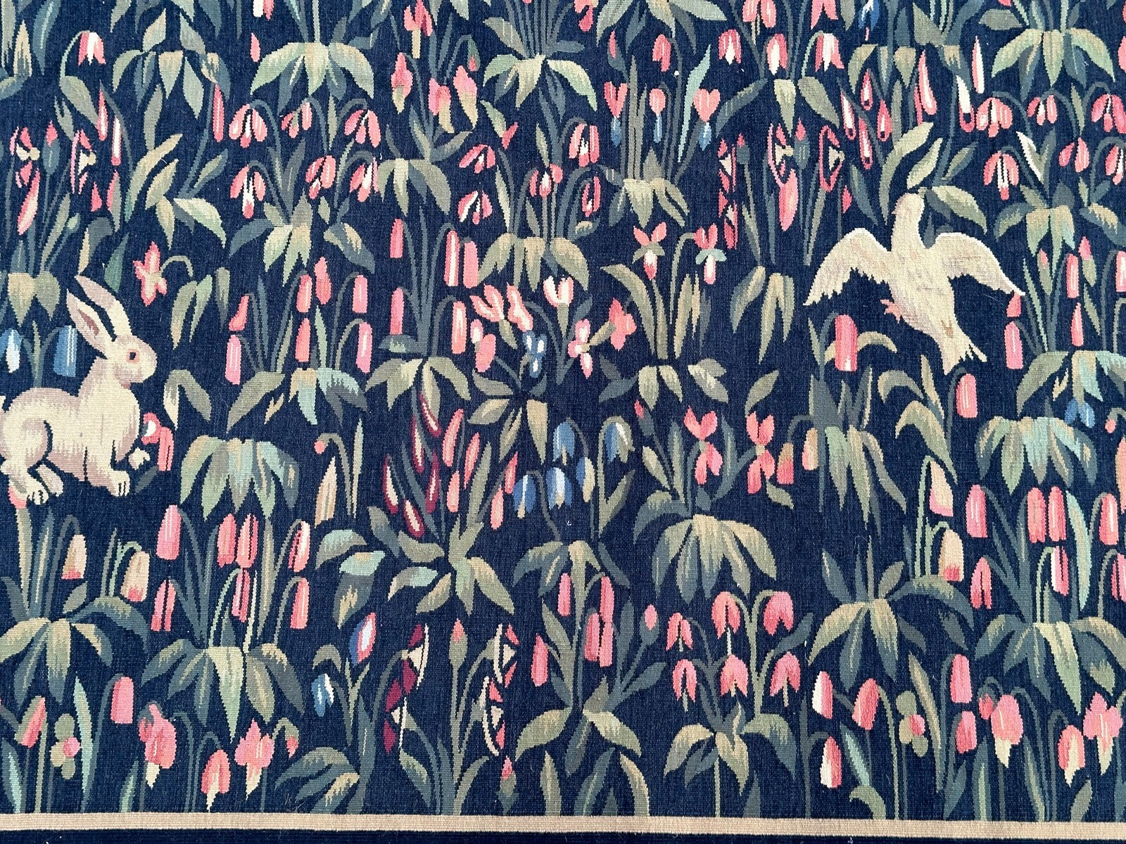 "An exceptional rare antique French Game park tapestry depicting Birds and Bunnies in a floral Ascending Landscape. Beautiful colorway, a true masterpiece."-DCR