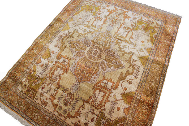 Rare Antique Silk Serrapi Rug Fine Ivory Gold 4x5 Herriz Rug 100% Silk