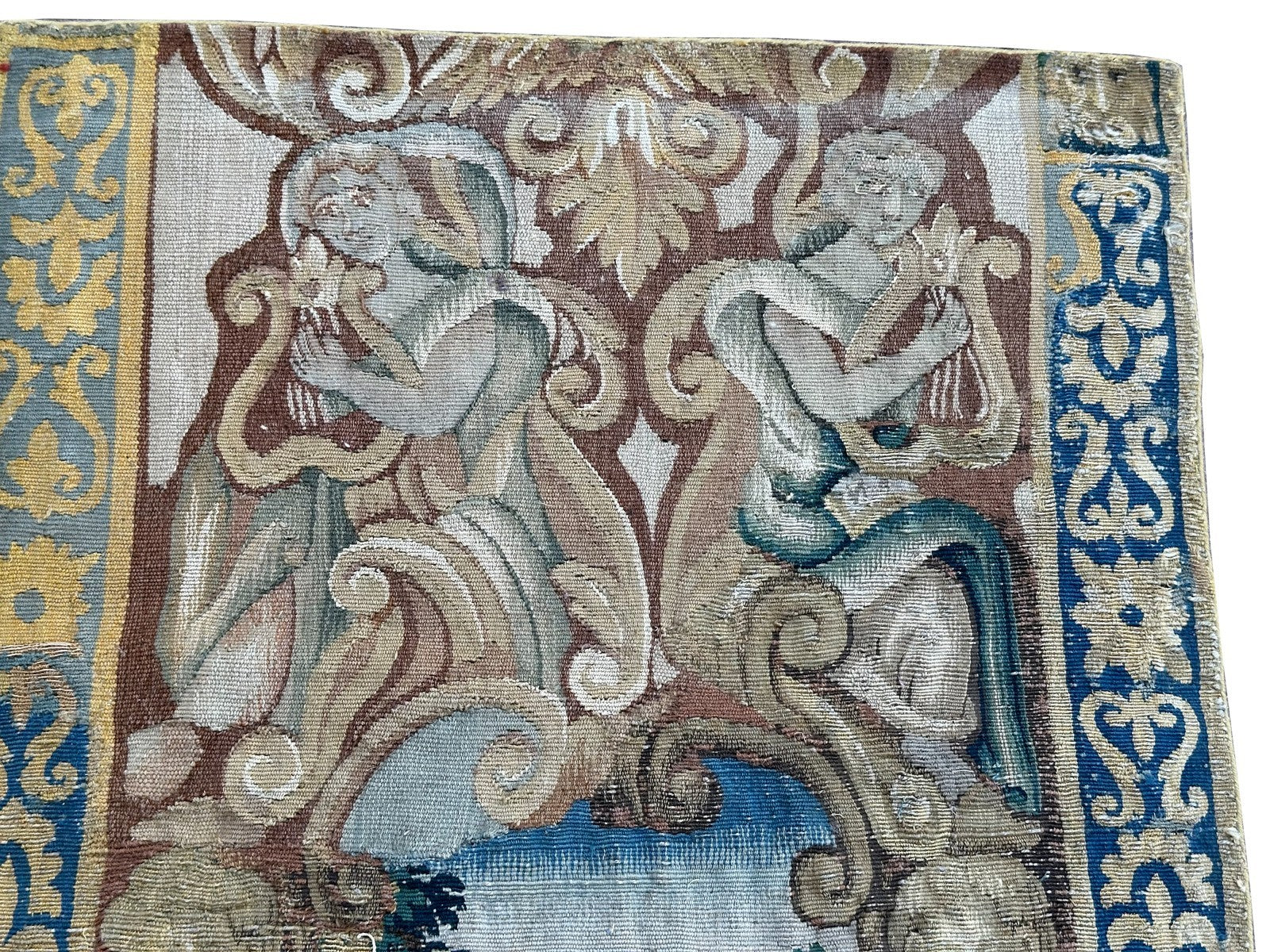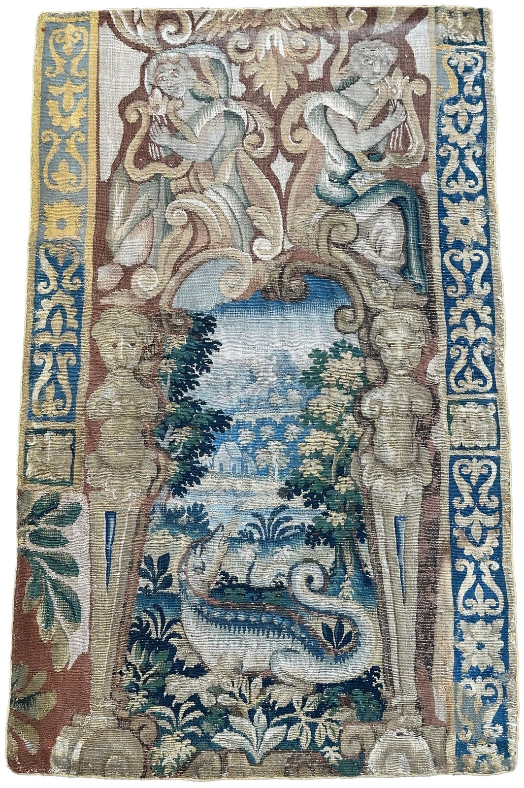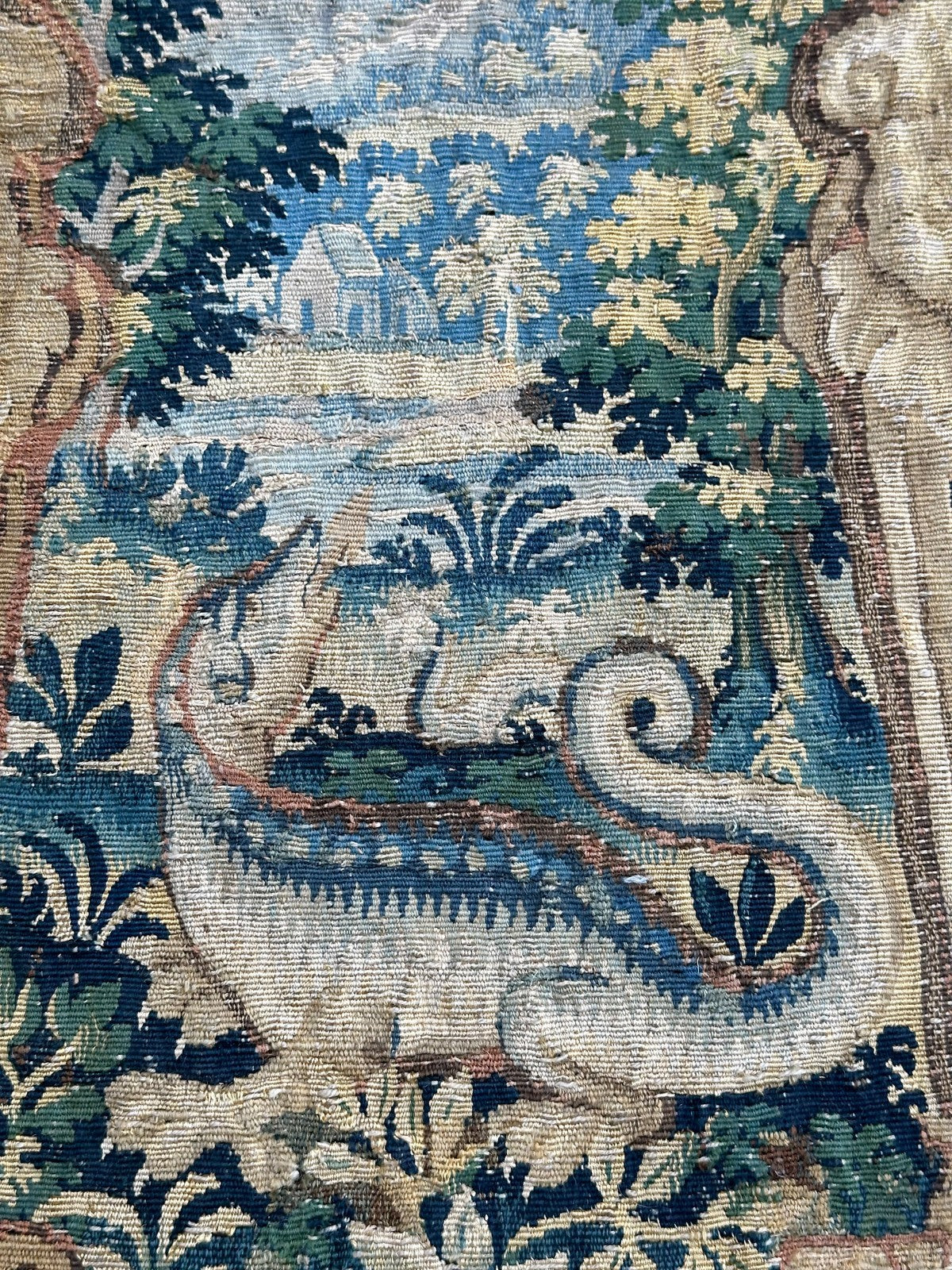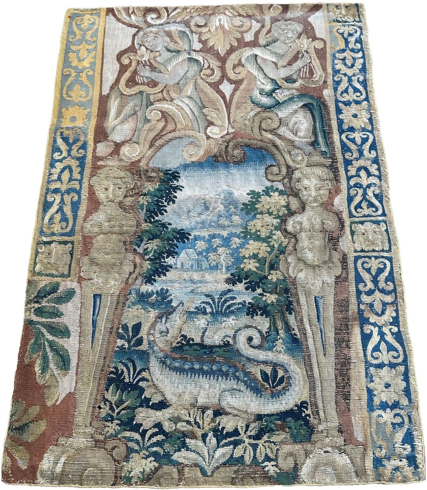 “This antique Flemish tapestry displays its original handwoven detailing with musical figures, ornate scrollwork, and a central landscape scene with a dragon, showing the authentic texture and character typical of historic textiles.”
