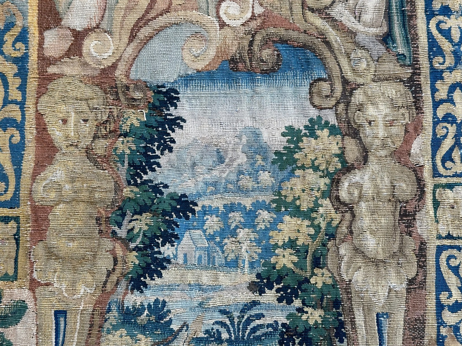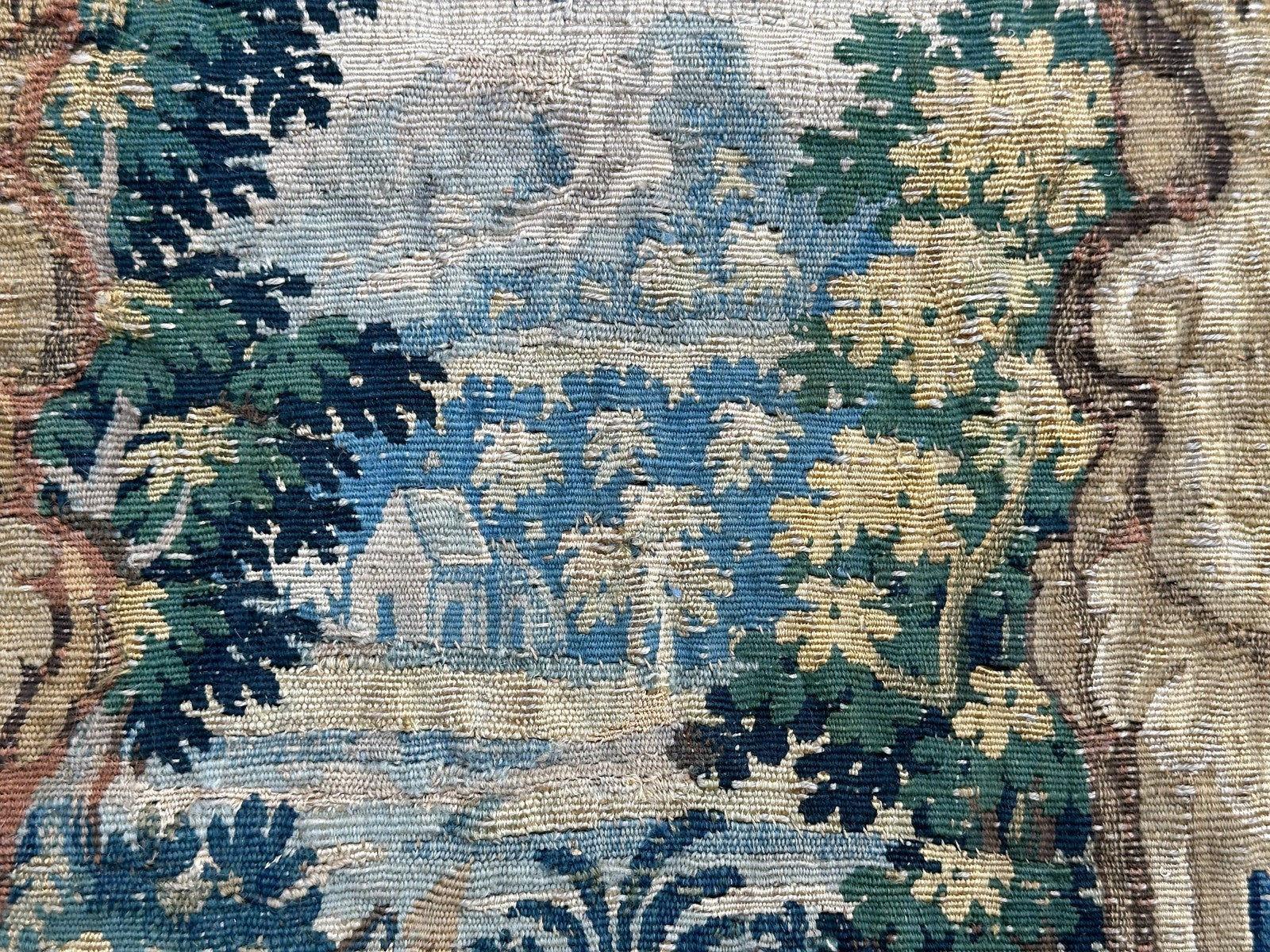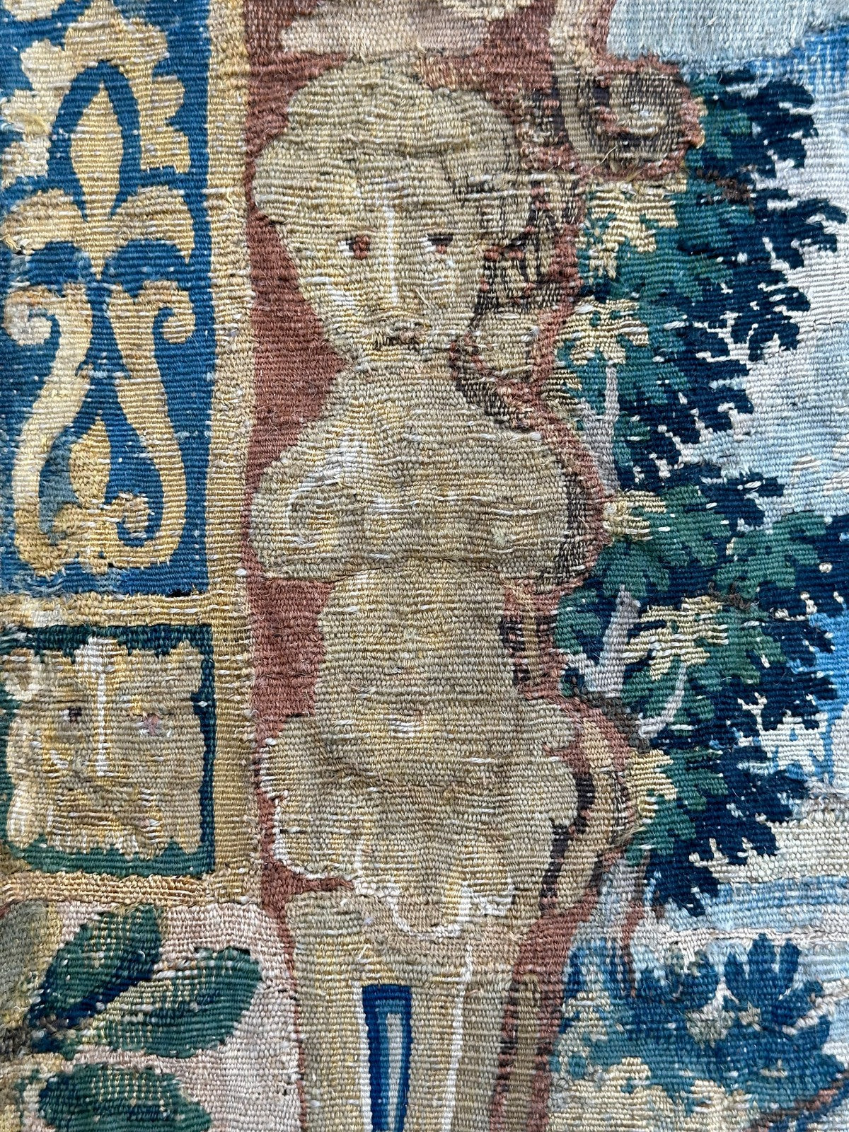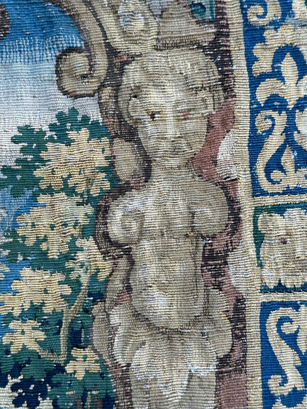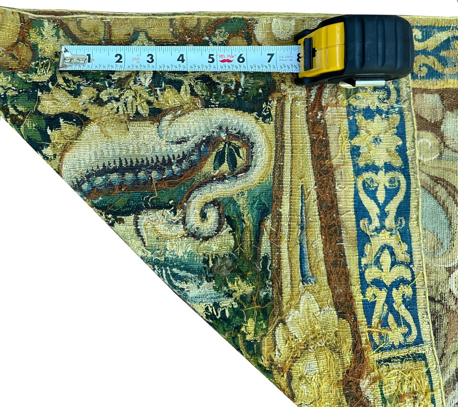 “This antique Flemish tapestry displays its original handwoven detailing with musical figures, ornate scrollwork, and a central landscape scene with a dragon, showing the authentic texture and character typical of historic textiles.”