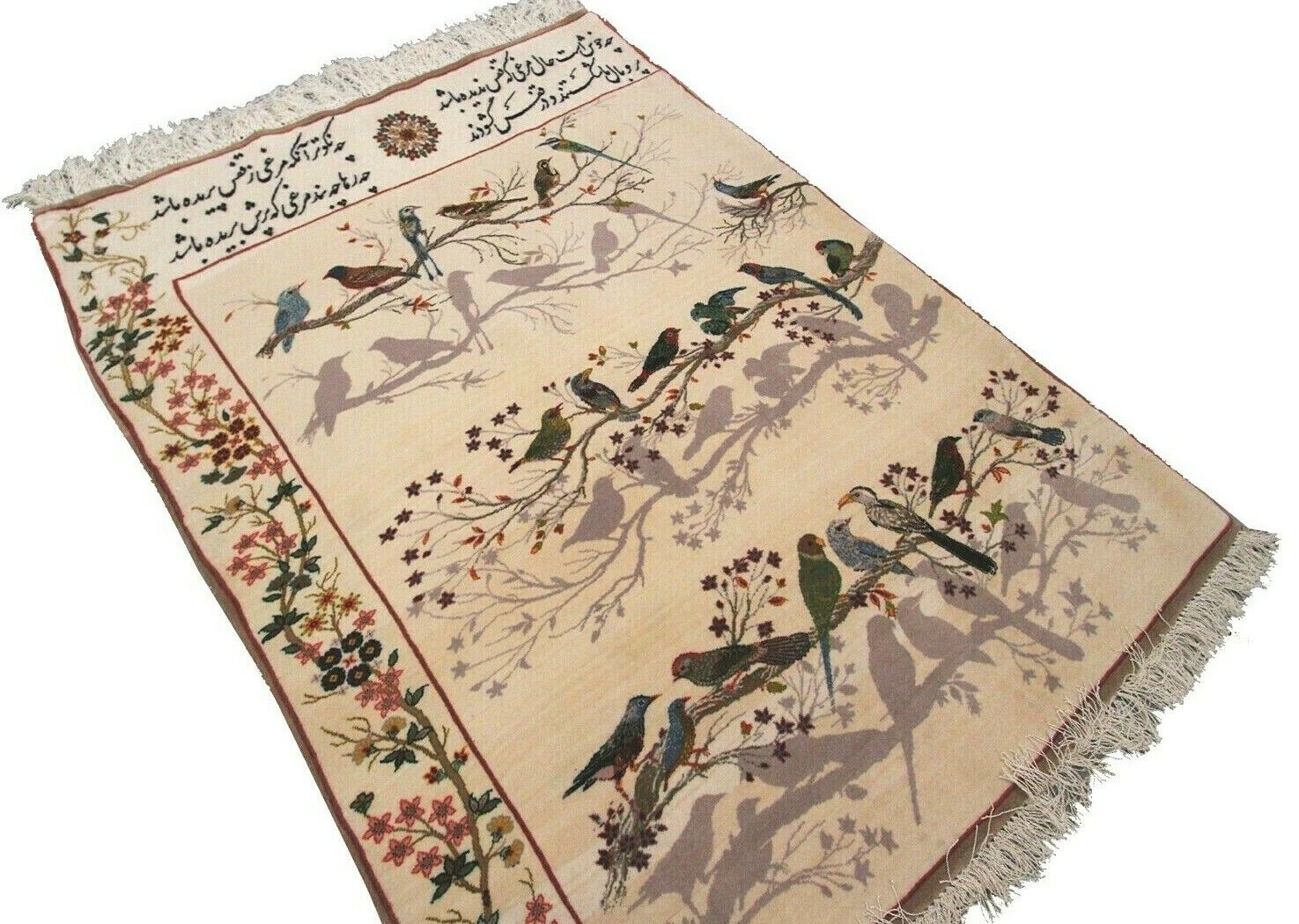 This genuine hand knotted  Wool  Rug with Silk Foundation by Designers Choice Rugs, is a true Piece of Art.  With its intricate and extremely Fine weaving and Poetry and Birds design, this rug portrays an exquisite opulence.