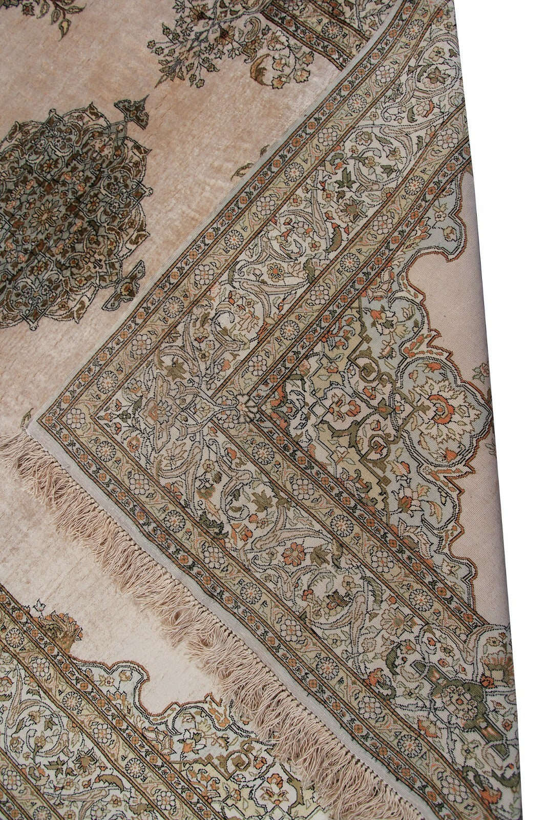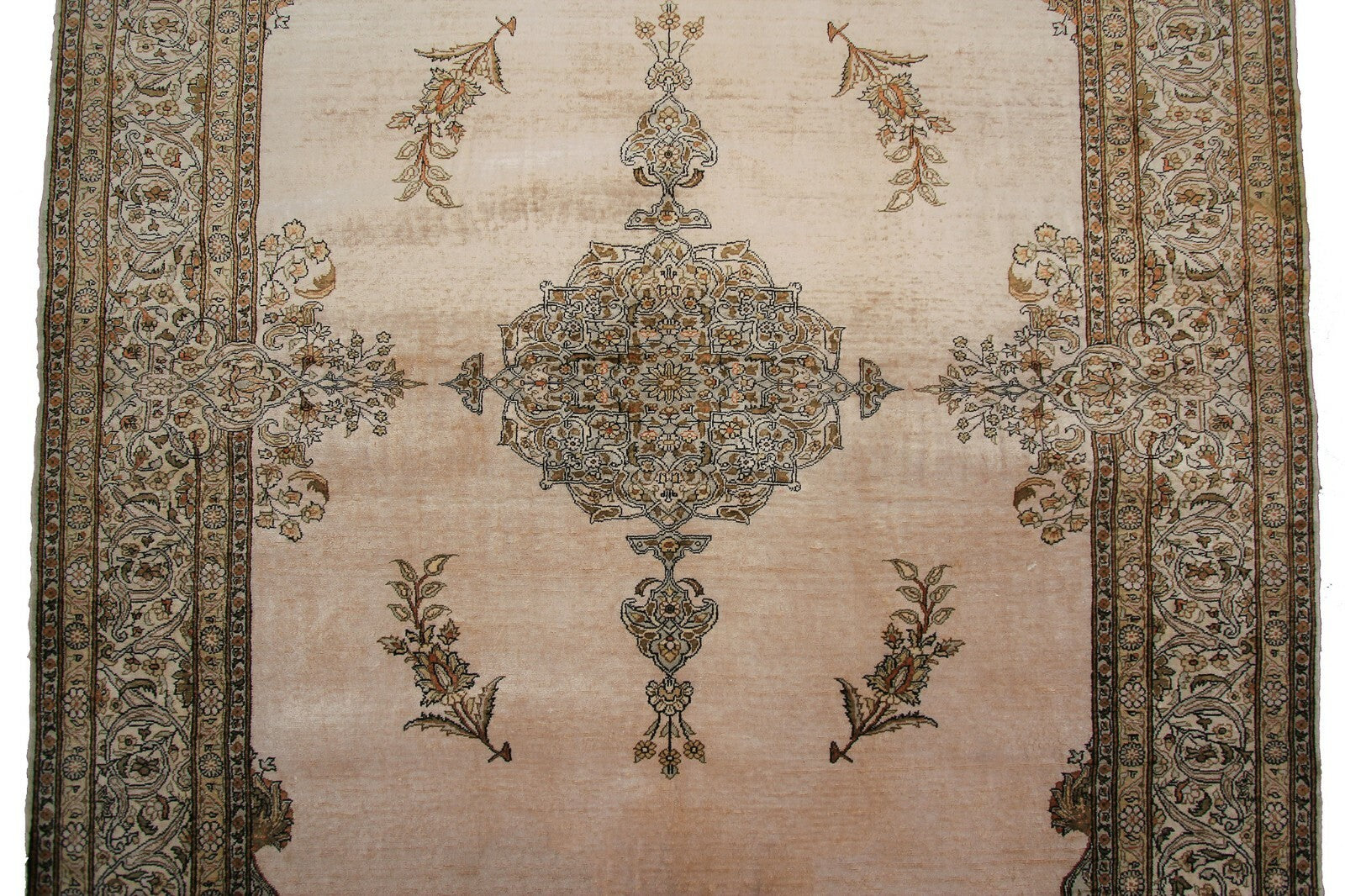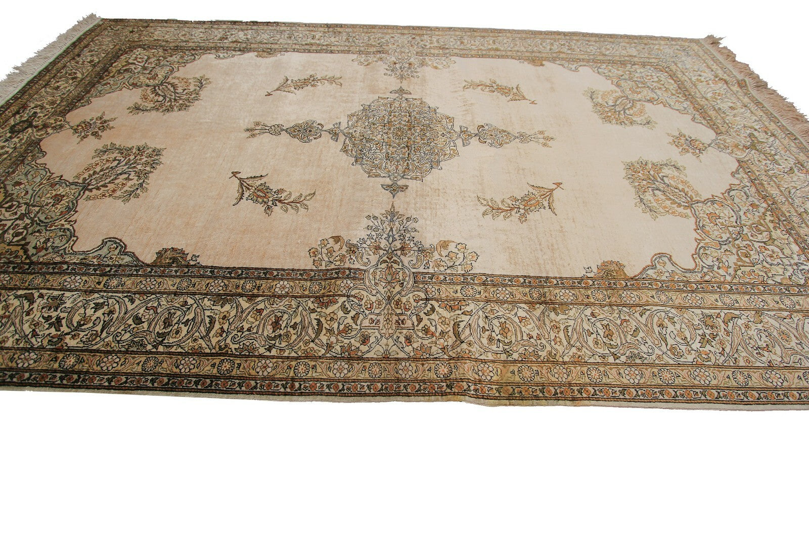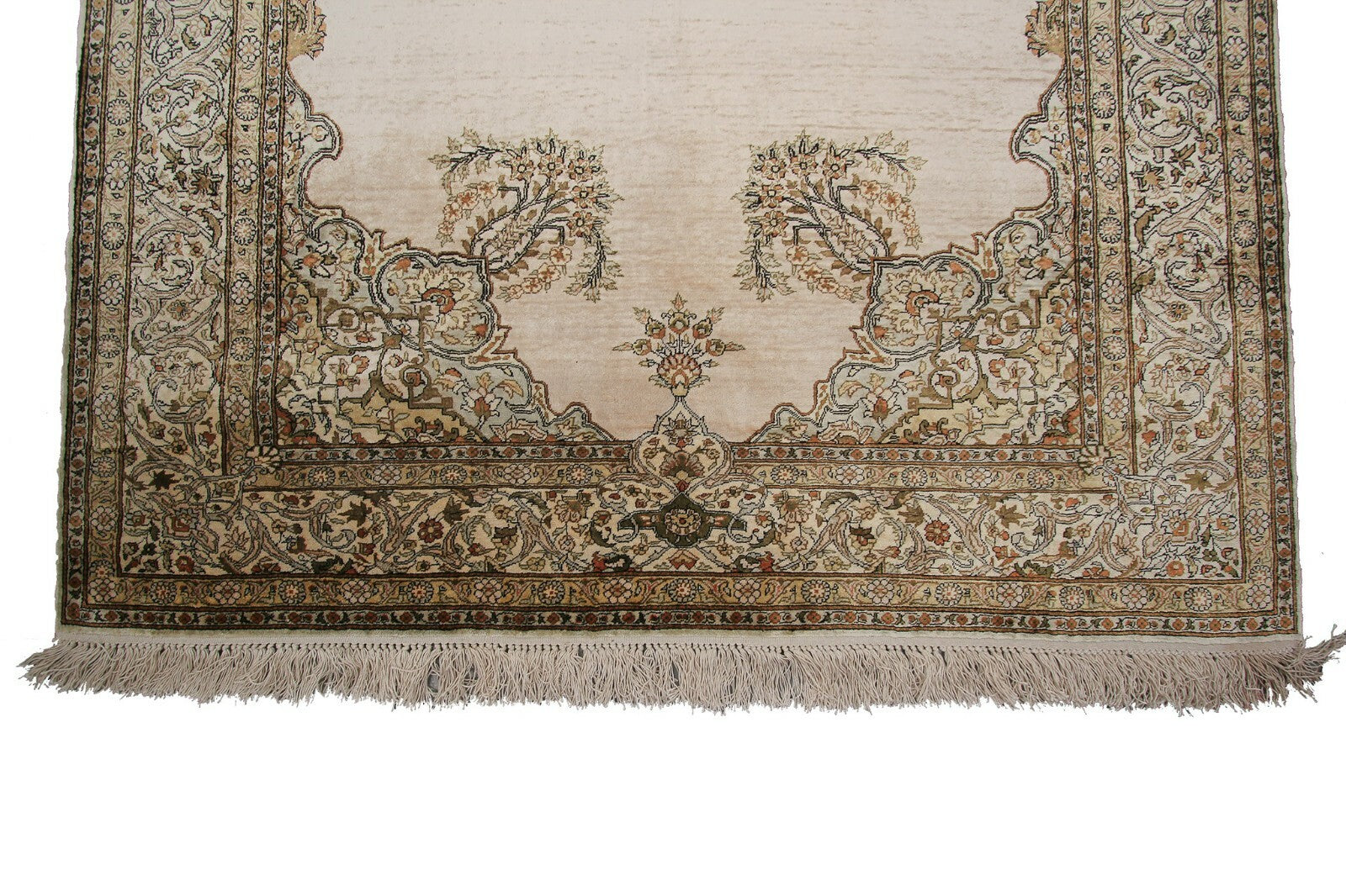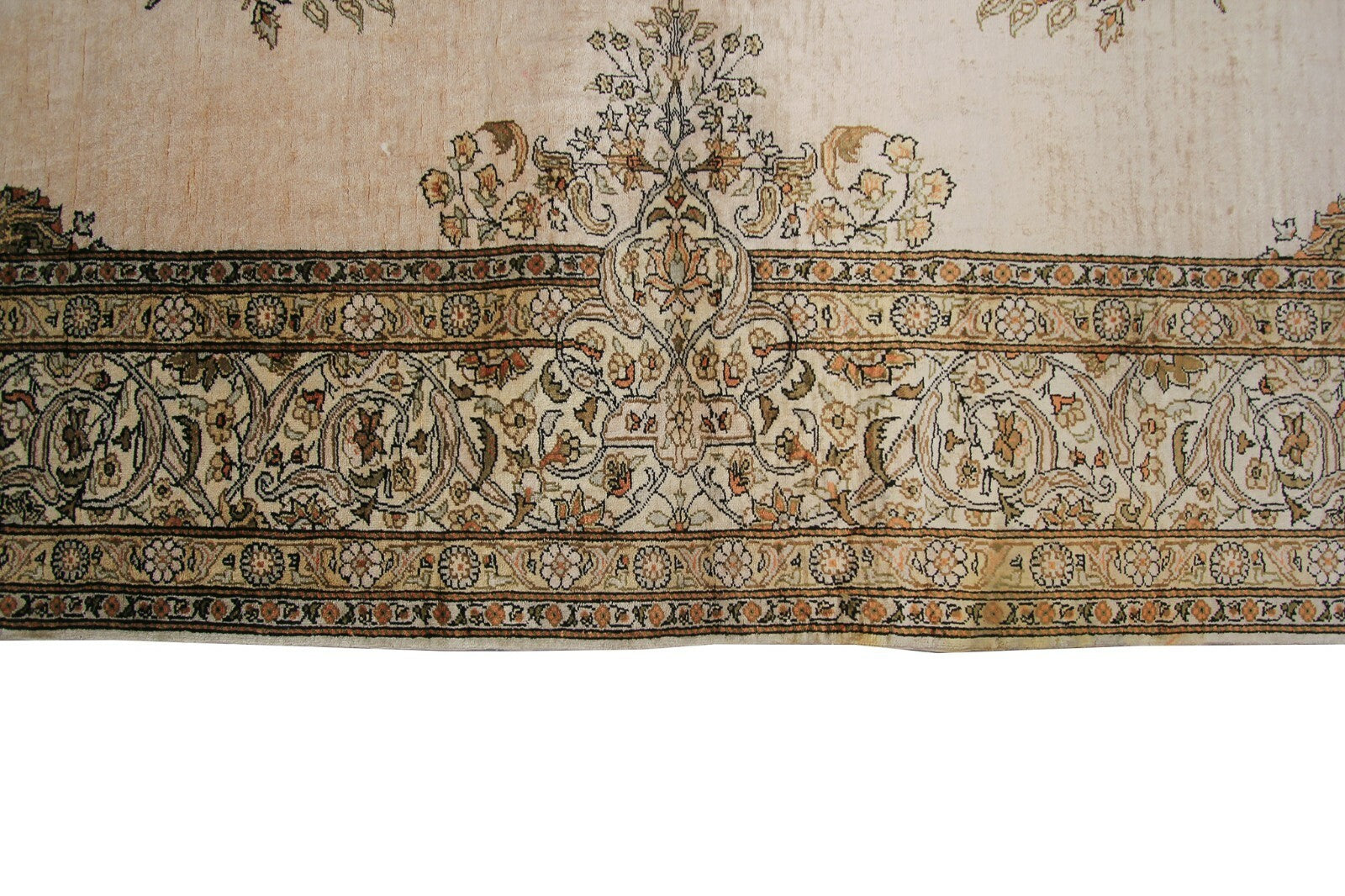 "This is one of the highest quality antique silk rugs that we have seen in our 40 years in the trade. It is 100% silk pile and foundation. This vintage Silk Hereke Kaysari has a very fine weave and intricate design indicating master weaver workmanship. We received it from a home where it was displayed hanging on the wall for a long time. It is in great original shape with no repairs or work at all. All four sides are intact and original. This is a great long term investment quality piece."-DCR
