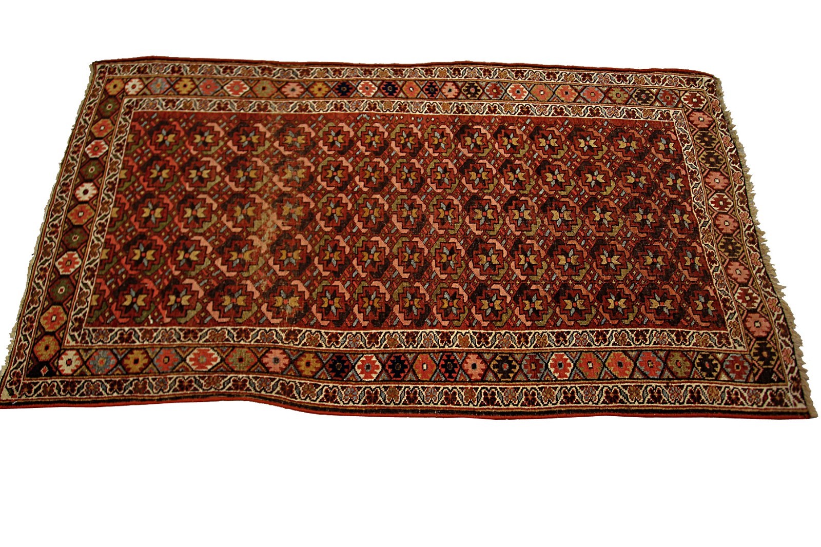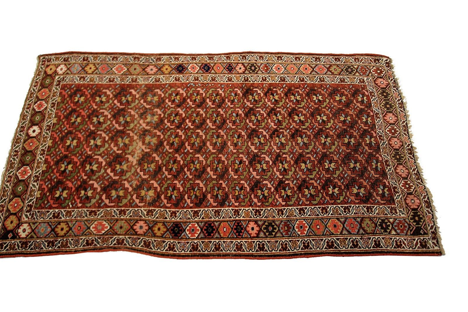 Good condition for a rug over 100 years old, medium pile, worn areas,