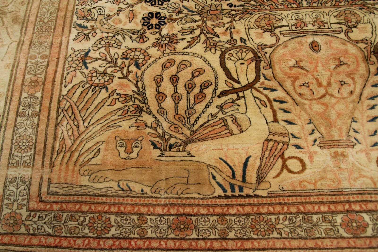 "This is an extraordinary, rare one of a kind pre 1900's Mohtasham . It has an incredibly fine weave and striking Bird, Vase & Lion design. This piece has an outstanding workmanship and fantastic Kork wool. Rugs of this caliber and quality and size are hard to come across and have always been highly desired. This piece was acquired from a prominent New York Estate"-DCR