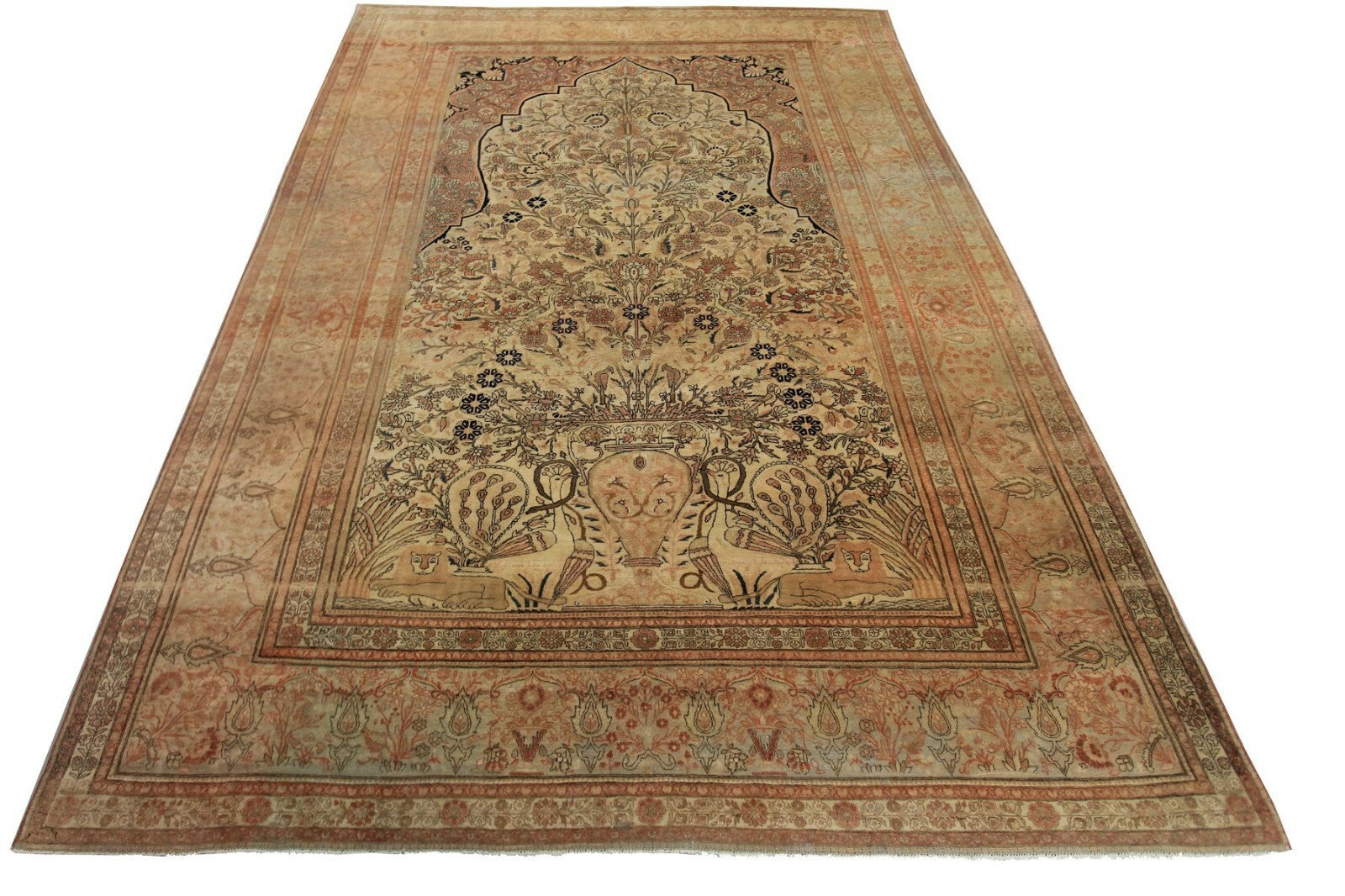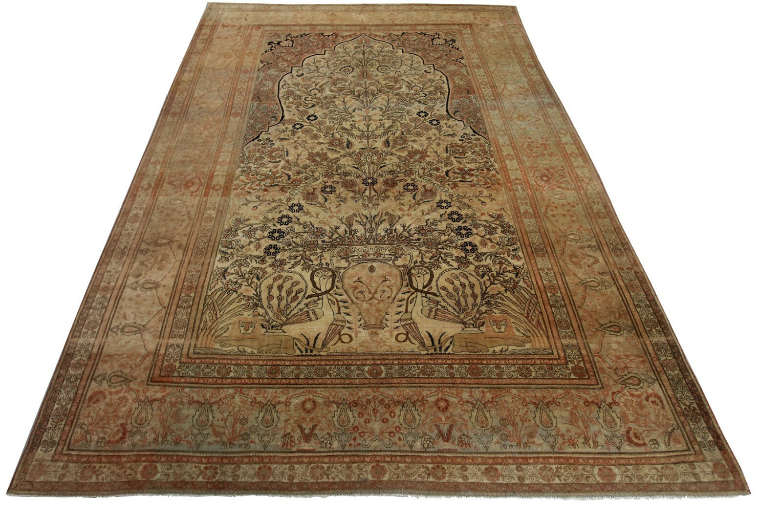 7x10 Fine Rare Antique Traditional Rug Vase Lions Birds Beige 224cmx305cm C.1870