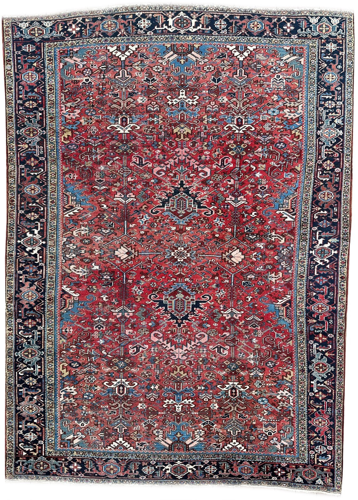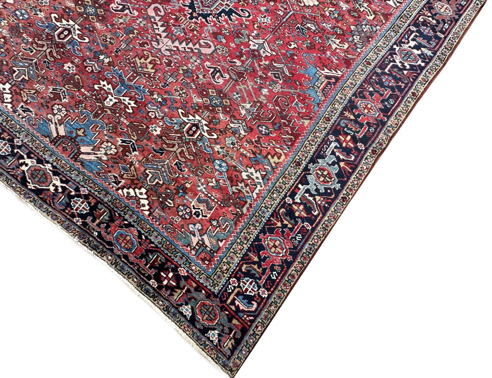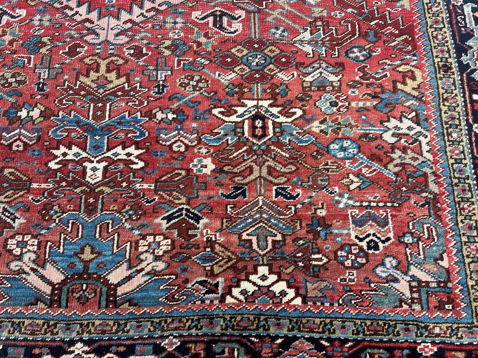 " This beautiful antique Heriz Serapi rug has a geometric design With with a soft red background. It came from a prominent Manhattan, New York Estate. This rug has been professionally cleaned. The cold climate helps nurture strong, quality sheep's wool. Because of this, Heriz Serapi rugs are often considered among the most durable antique rugs ever made."-DCR