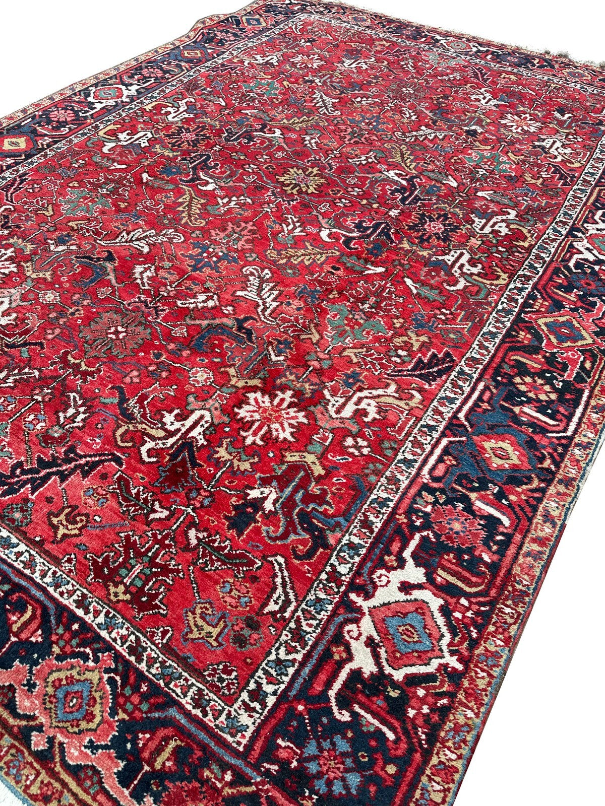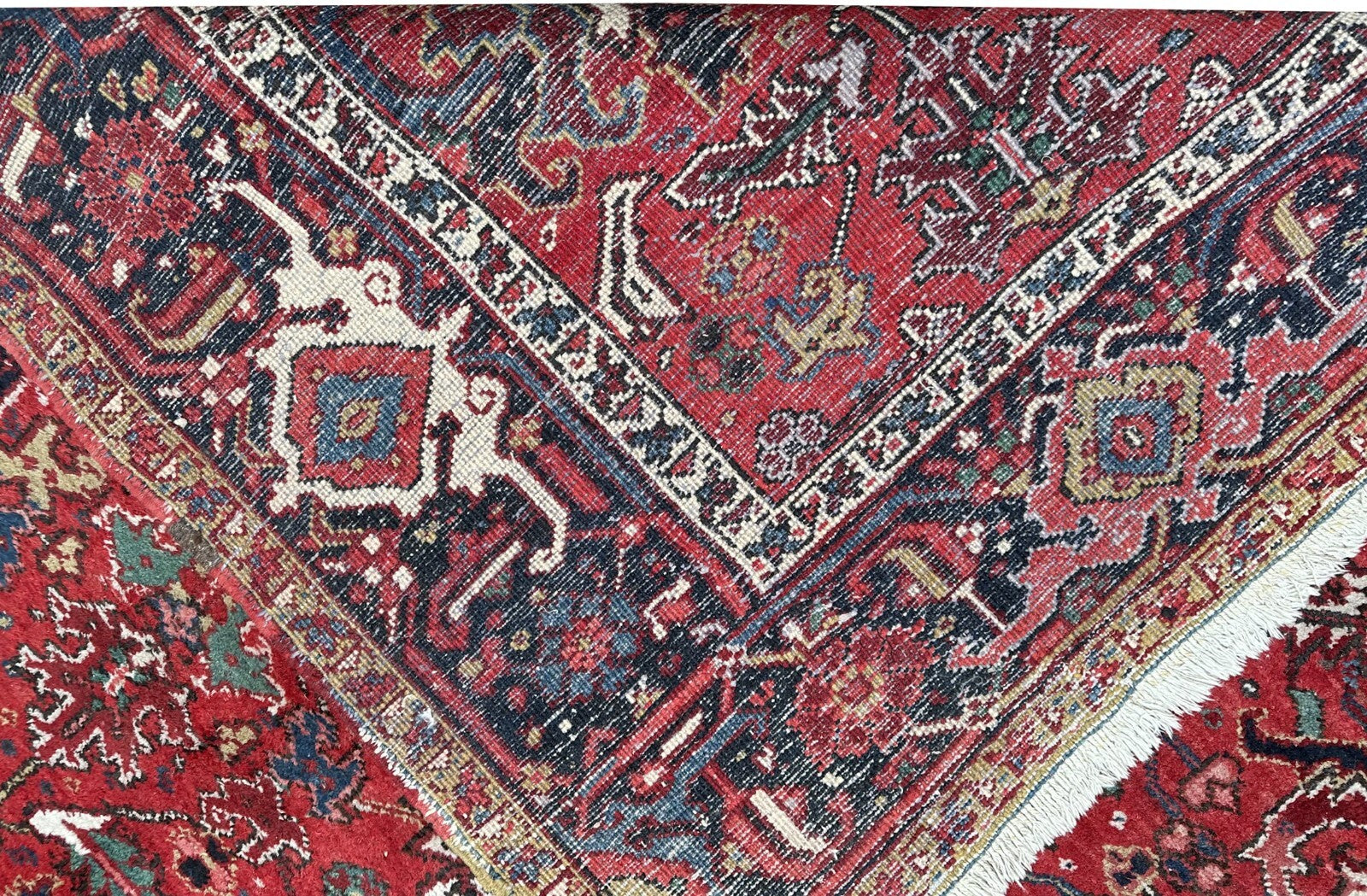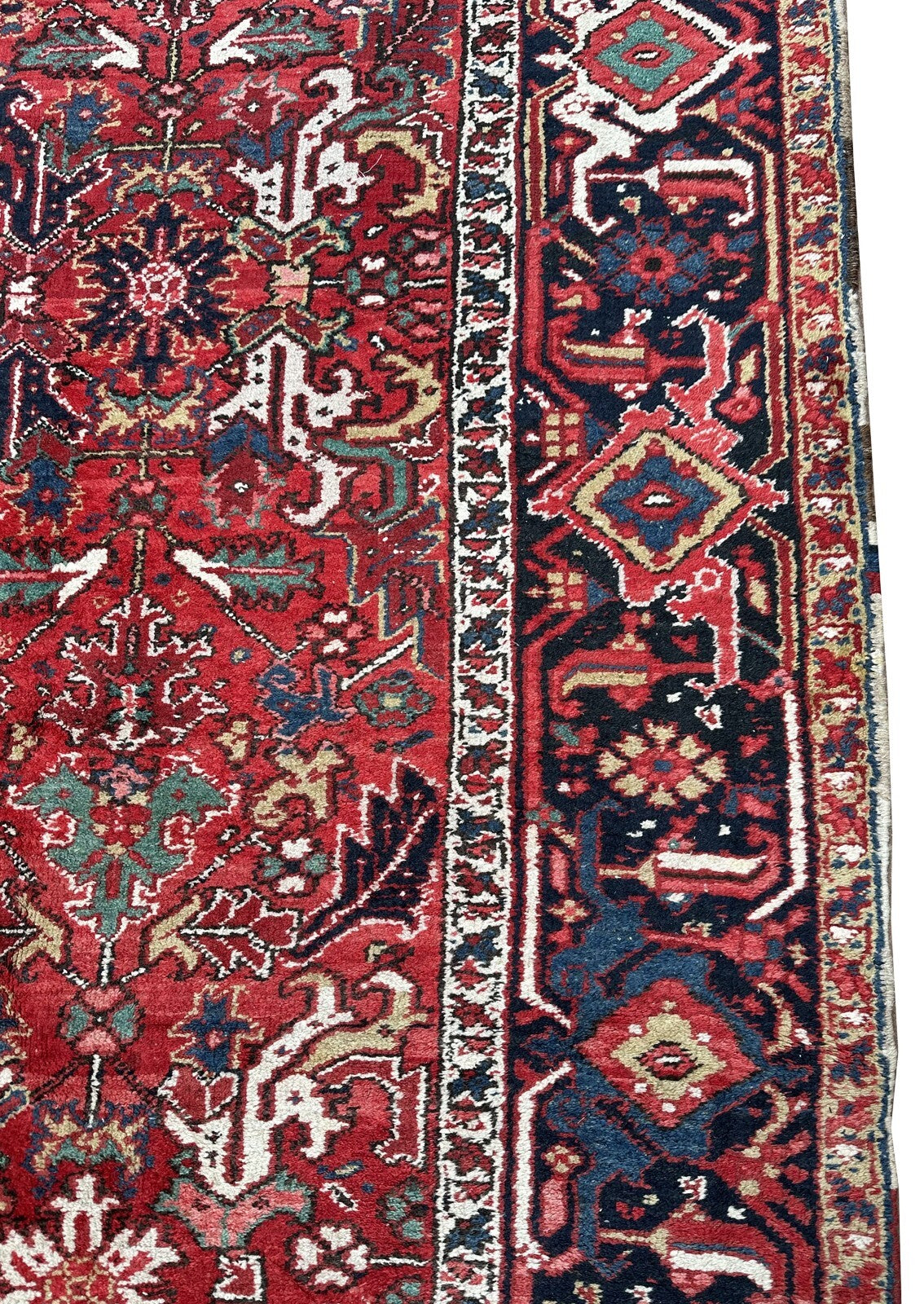 " This is a magnificent, exceptionally high quality antique piece -geometric with soft red tones. This rug has been professionally cleaned. The cold climate helps nurture strong, quality sheep's wool. Because of this, Heriz Serapi rugs are often considered among the most durable antique rugs ever made."-DCR