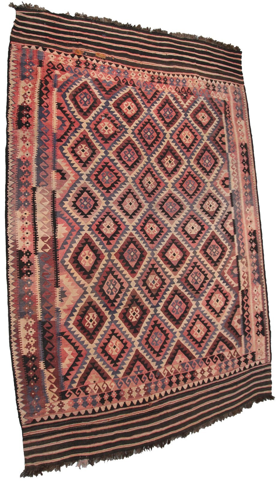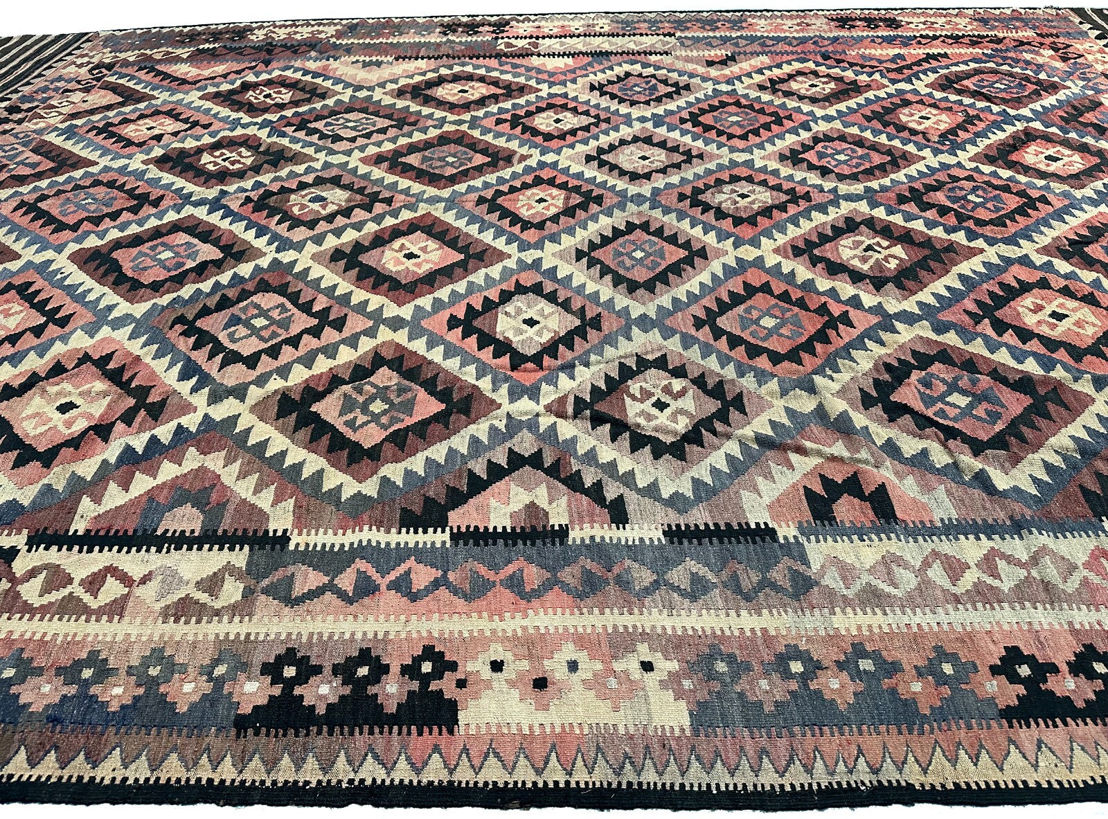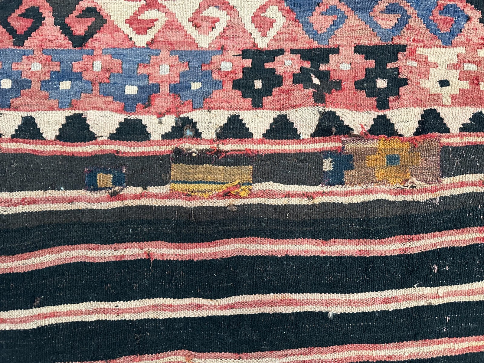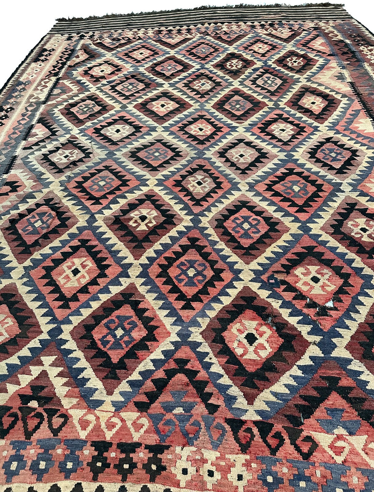"Very cool antique tribal Kilim with a rare geometric overall pattern and fantastic, color palette. Beautiful quality piece with a tribal vibe and unique colorway!"-DCR