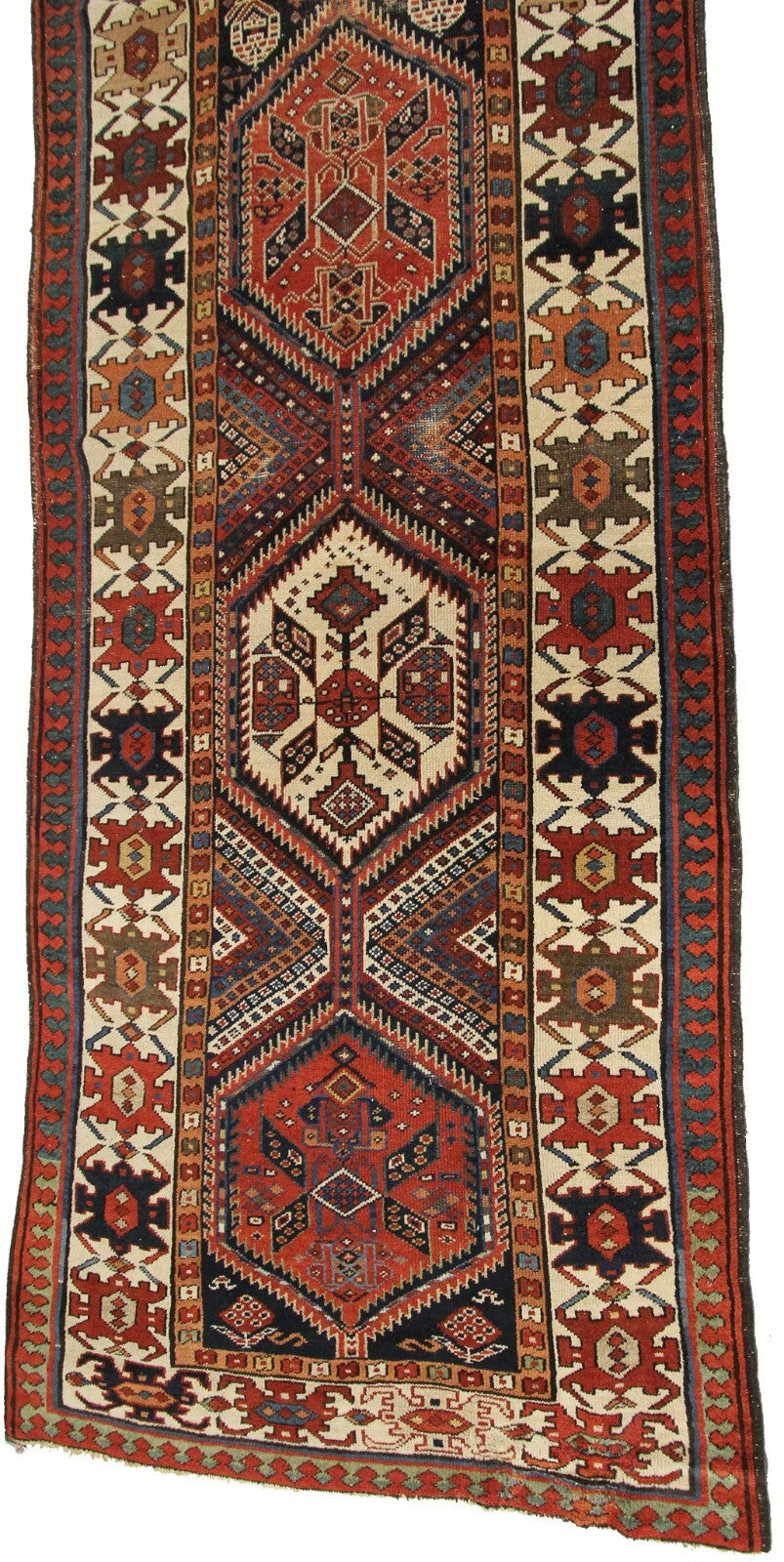 "This is a truly magnificent authentic antique Caucasian Kazak runner in a very high quality on wool foundation. It has a geometric design with artisan work. This piece was acquired from a Manhattan estate." -DCR